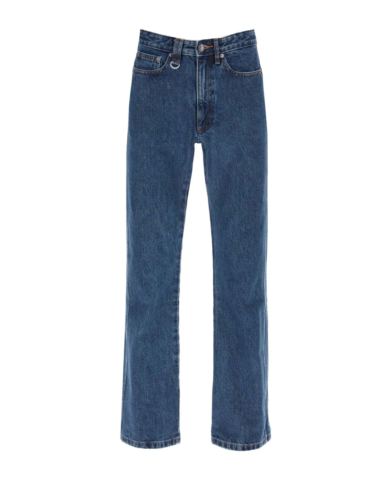 A. P. C. five-pocket jeans cut from indigo denim to a straight leg, detailed with self-fabric side bands and a double belt loop detail with D-ring at the front waist. Zip fly with monogram button, mid-rise regular fit. The model is 187 cm tall and wears a size 30.