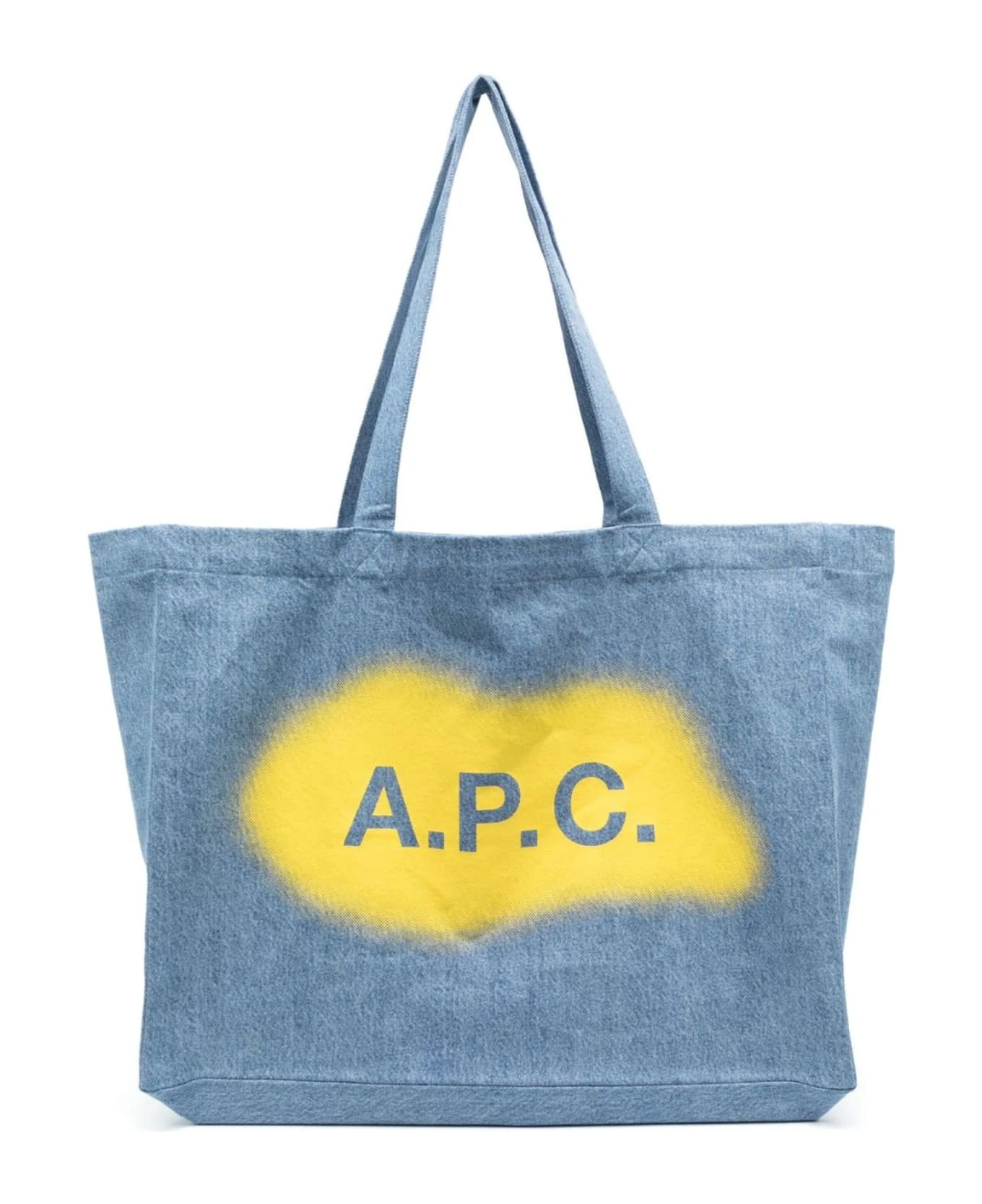Blue cotton tote bag, logo print to the front, spray-paint effect, open top, two long top handles, main compartment, depth 15 cm, height 36 cm, strap 29 cm, width 46 cm