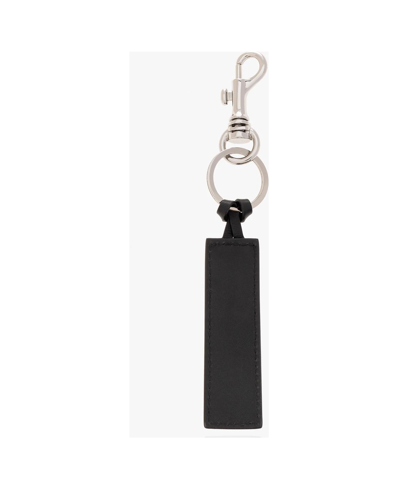 Black keyring from A. P. C. Arriving with a leather band with an embossed logo, this item features a silver-tone snap hook clasp.