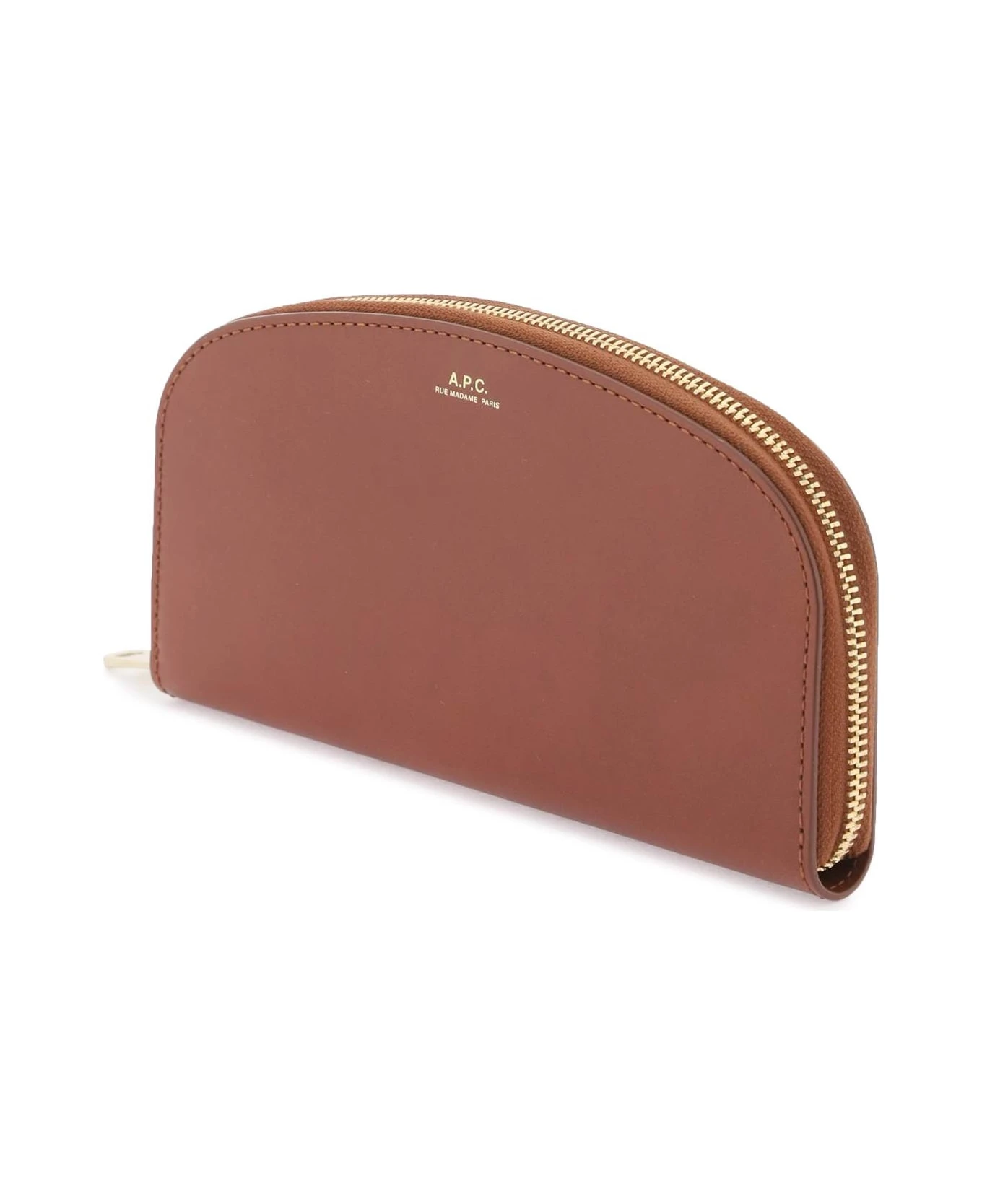 Demi Lune wallet by A. P. C. crafted in leather and characterized by a semi-rounded shape. Contrasting lettering logo at front. Fabric interior with two gusseted pockets, a central zippered pocket, two open flat pockets and eight credit card slots. Gold-finished metalware.