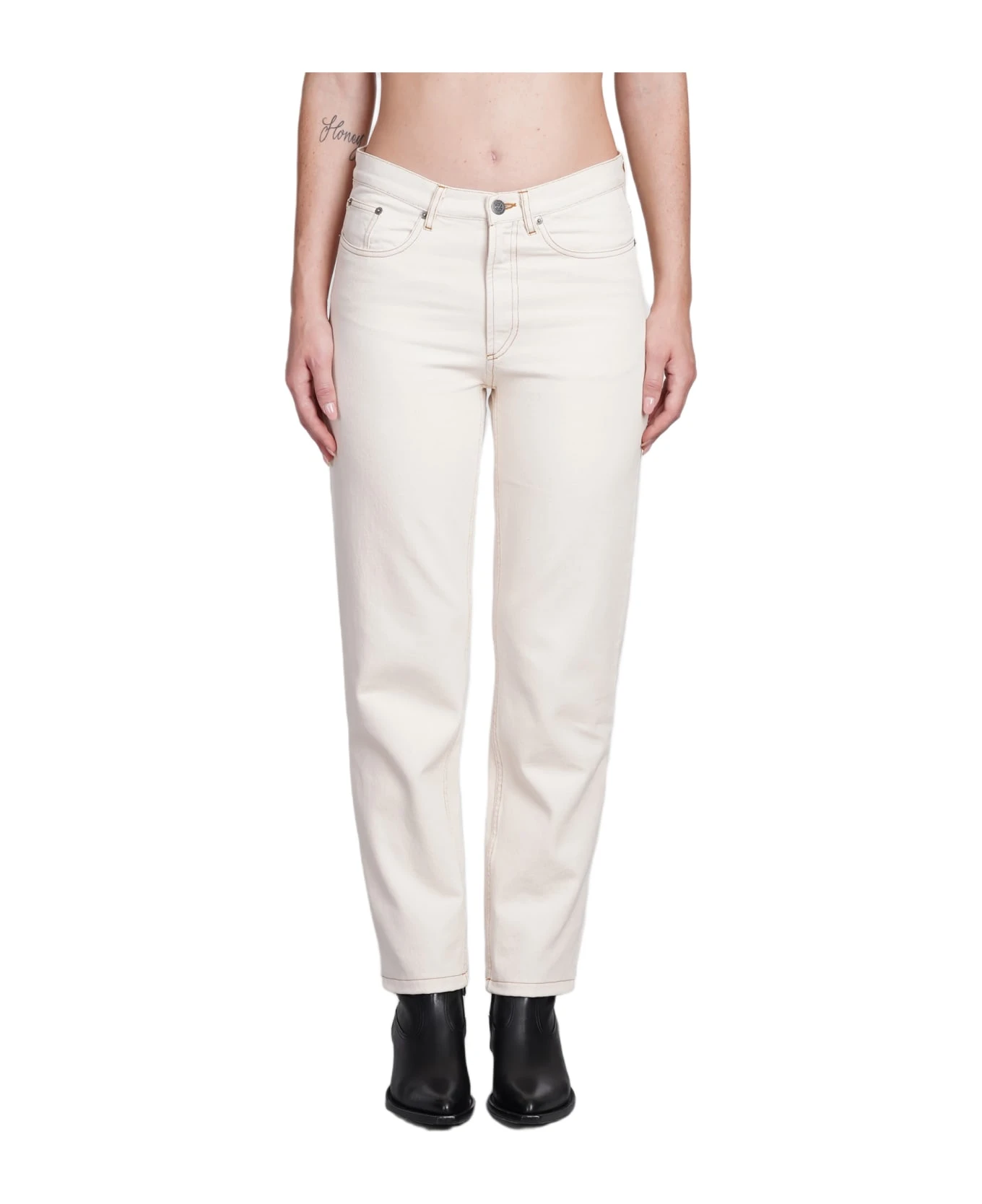 Martin f Jeans in beige cotton, belt waist, revers, long sleeves, prince of galles texture, flap pockets, 70% virgin wool, 25% polyamide, 5% others fibers, Made in Romania, Model is 180 cm and wears size 34