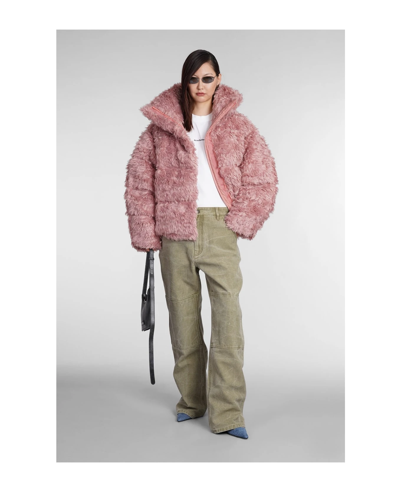puffer in rose-pink acrylic, high collar, padded design, frontal buttoning, long sleeves, furry style, 57% acrylic, 25% Polyester, 18% mohair, Made in China, Model is 180 cm and wears size 34