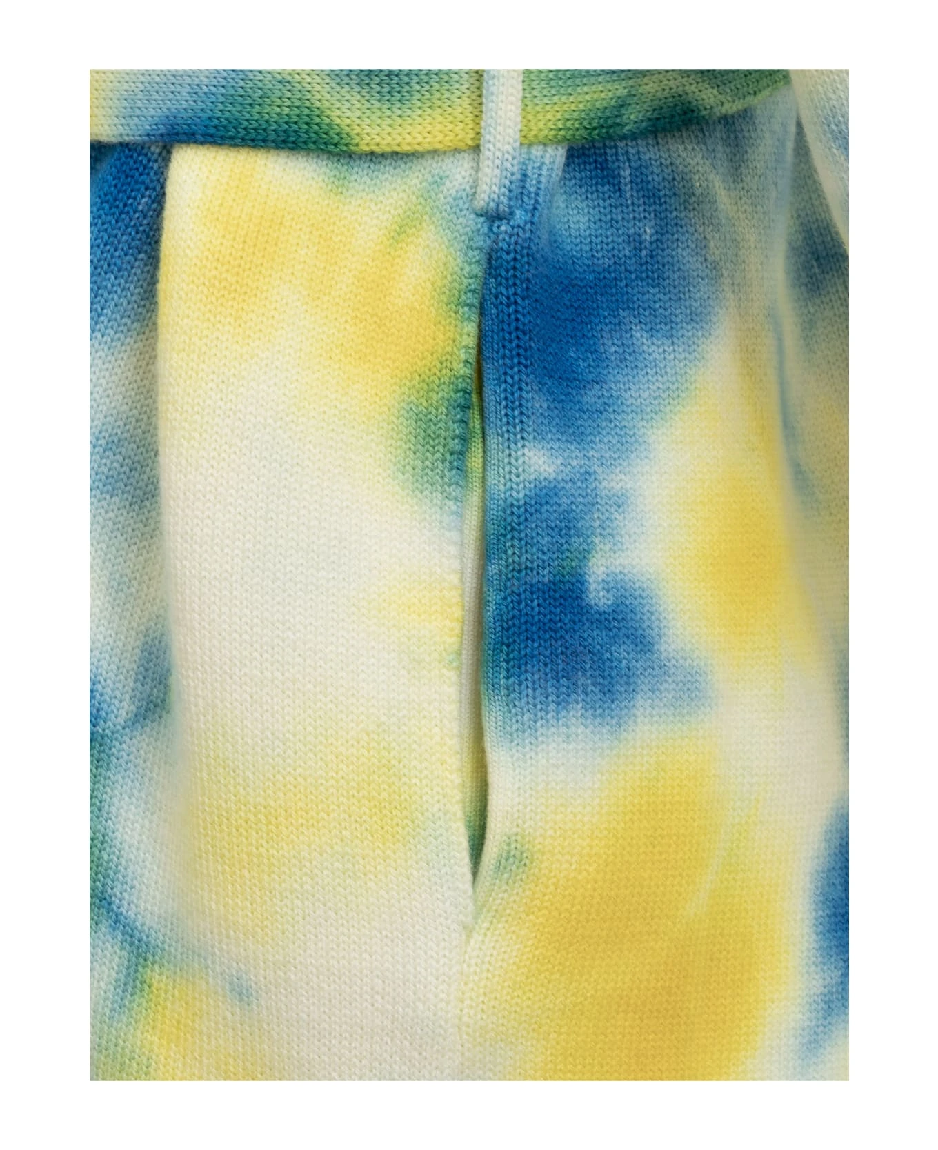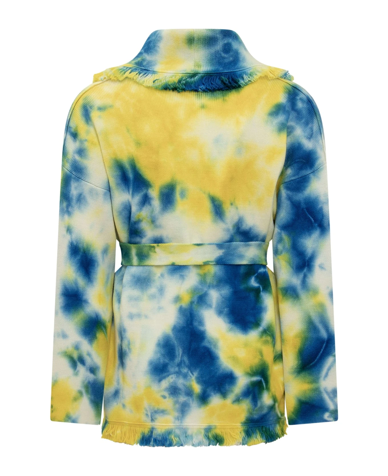 Cardigan with V-neckline. Belt closure. Fringed ends. Two pockets on the side. Tie-dye pattern.
