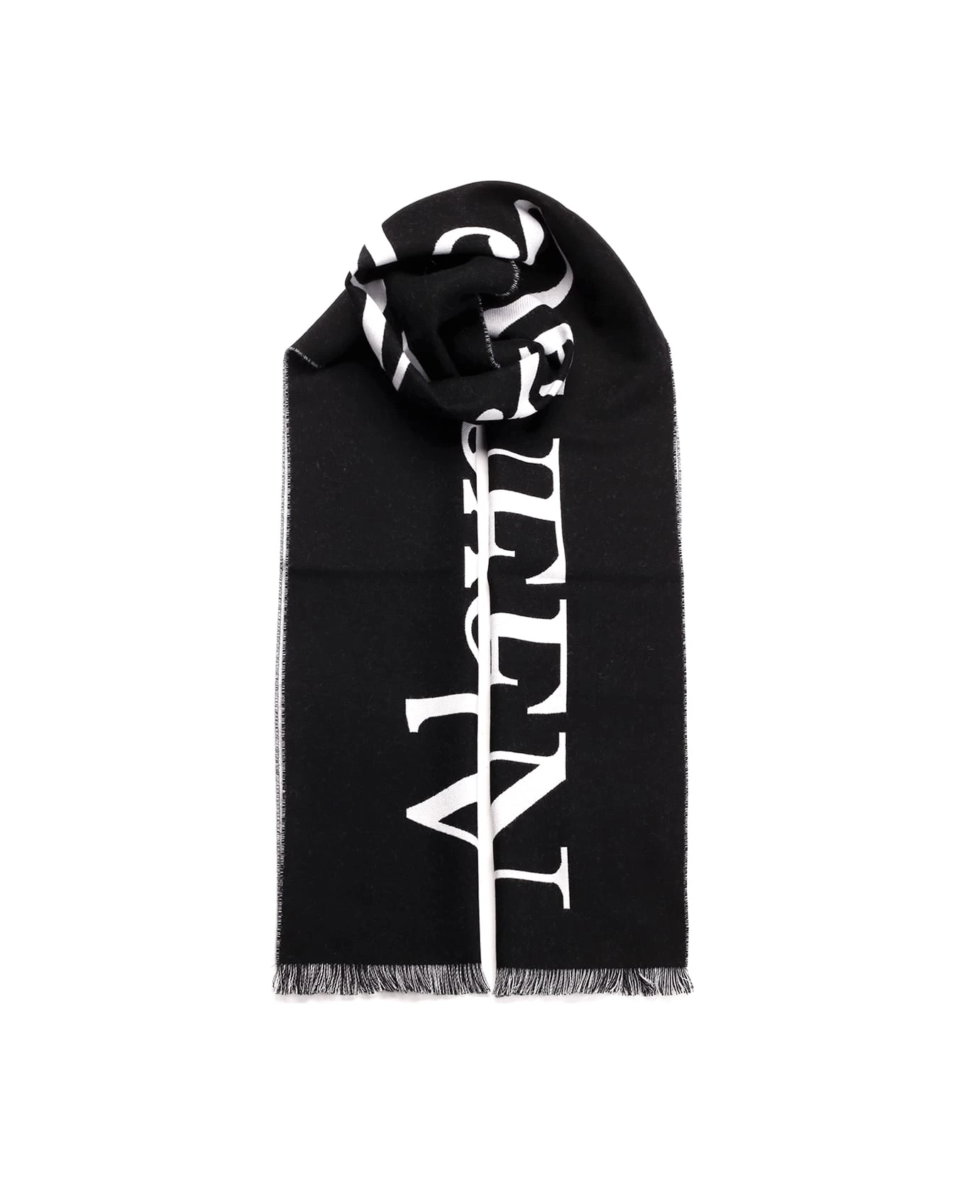 Black ‘Classic Logo’ scarf from Alexander McQueen in wool, white logo, fringes at the ends.