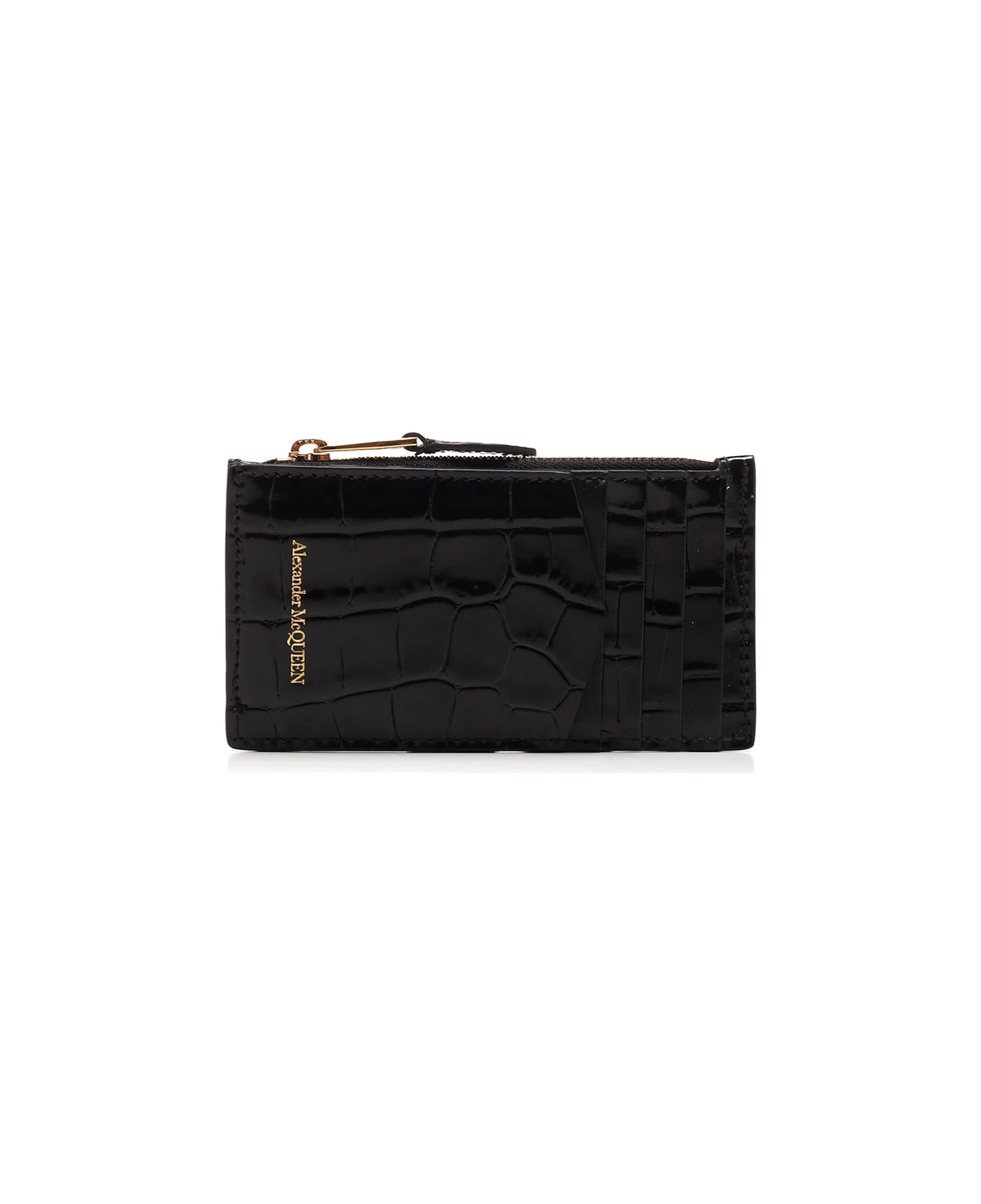 Card holder in black crocodile-effect leather with zip and metal skull representative of the Alexander McQueen brand.