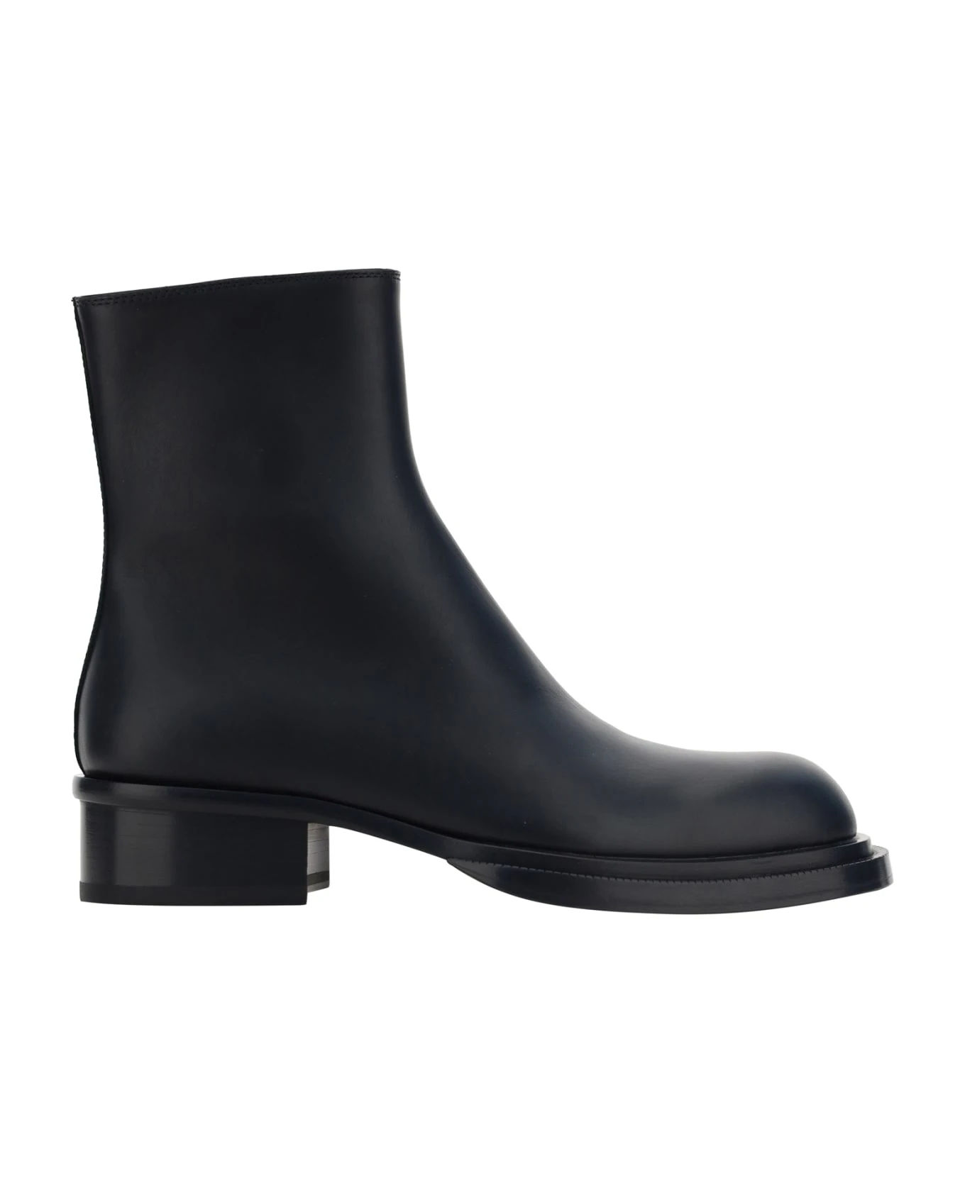 Calfskin cuban stack ankle boots by alexander mcqueen, beveled round toe, ankle-length design, zipper closure at inner side panel, leather block heel, shiny leather design.