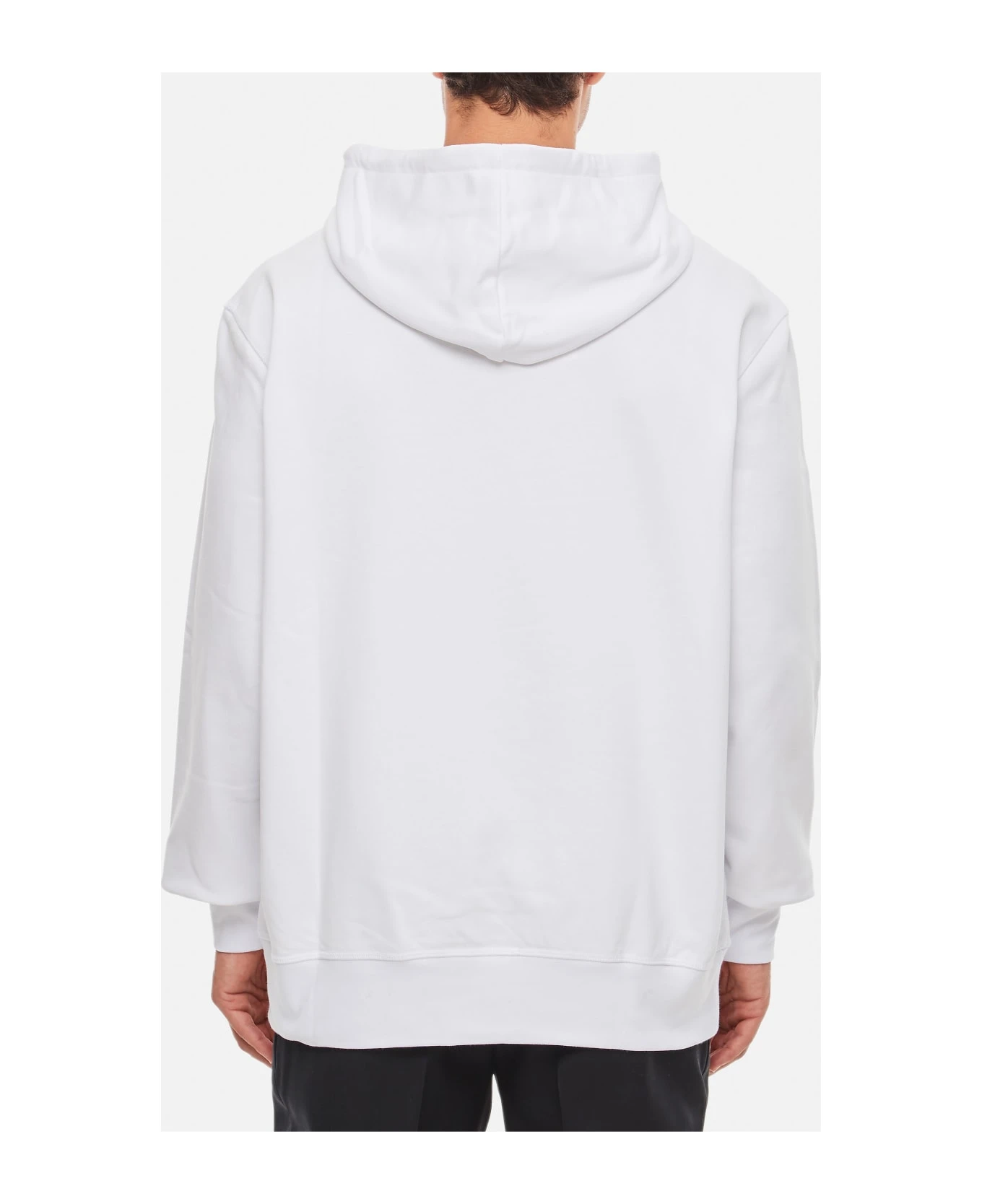 Ribbed cuffs and hem. Front print detail. One front kangaroo pocket. Color: white.