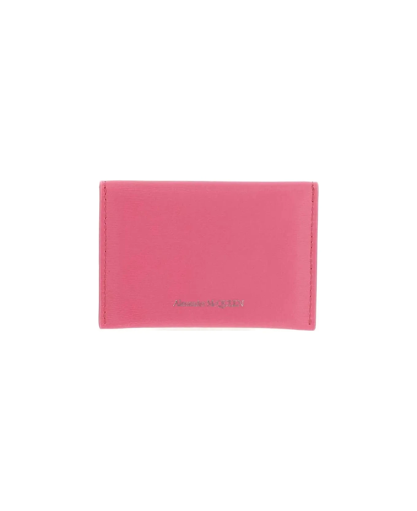 Alexander McQueen card holder in psychedelic pink leather with 3D silver-finish metal skull plaque on the front, embossed silver logo on the back, flap with snap closure and two card slots.