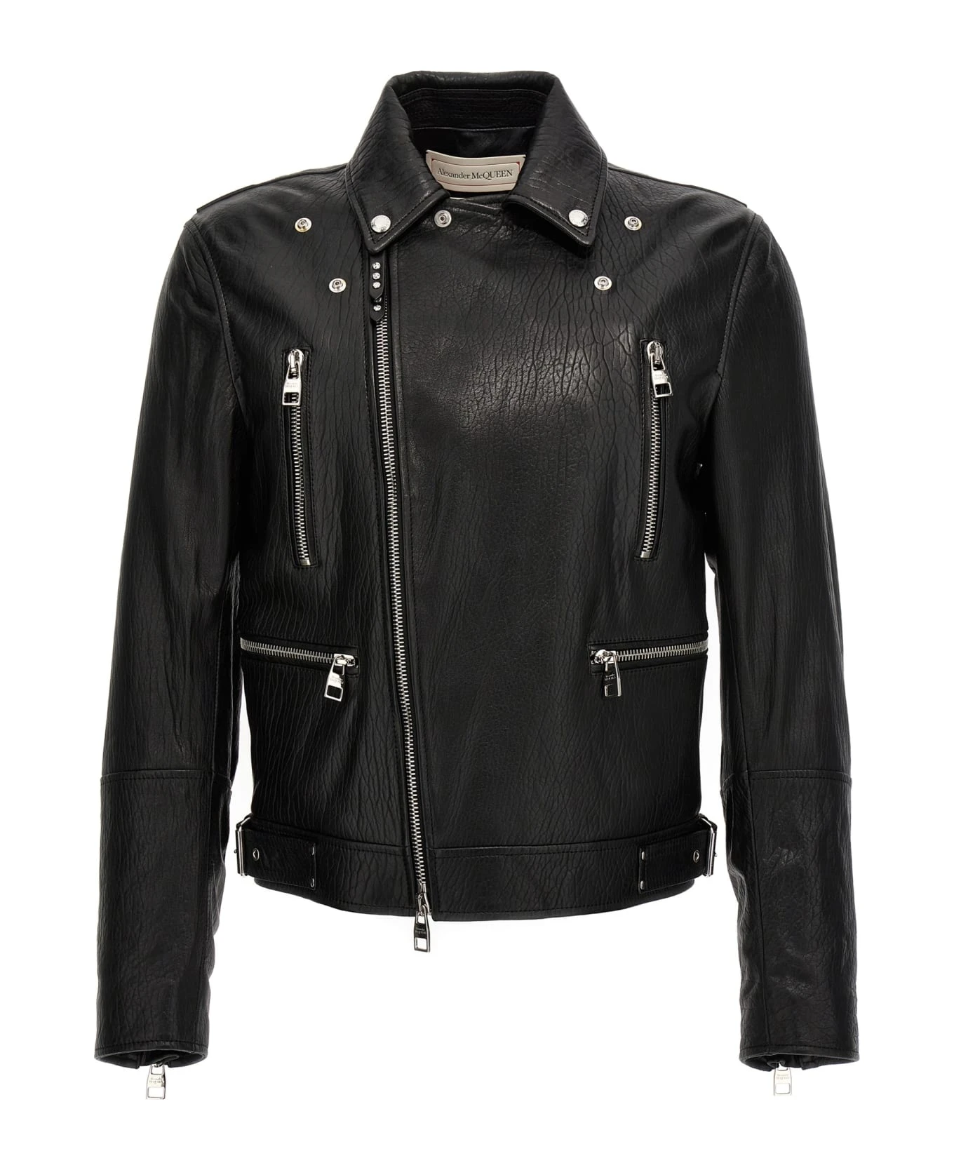 Leather jacket with texture, zip closure, pockets and long sleeves.