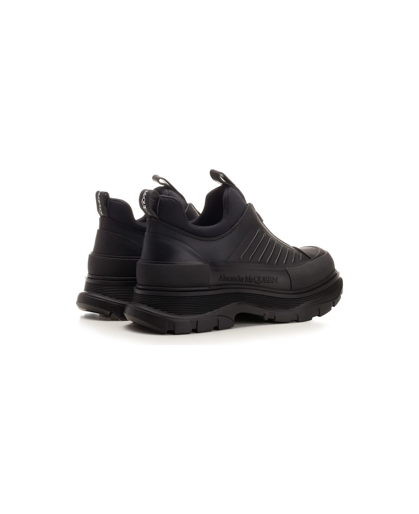 “Tread Slick” low top shoes from Alexander McQueen, in black leather, with front zip, reinforced toe cap and high sole.