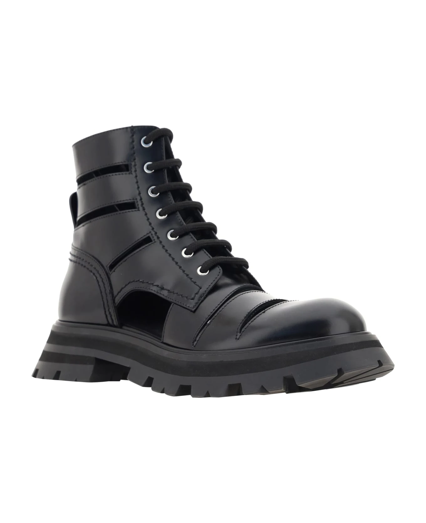 Calfskin wander combat boots by alexander mcqueen, all-over cut-out details, lace-up front closure, ankle-length pattern, textured sole.