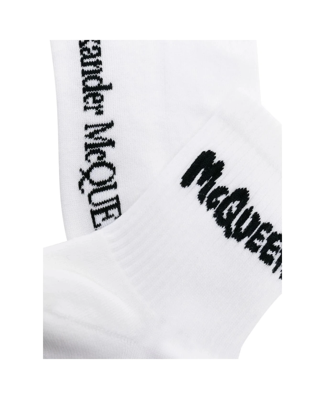 Alexander McQueen socks for women made of white cotton blend and decorated with black McQueen Graffiti motif at the ankle. Model finished with contrasting logo under the sole of the foot.