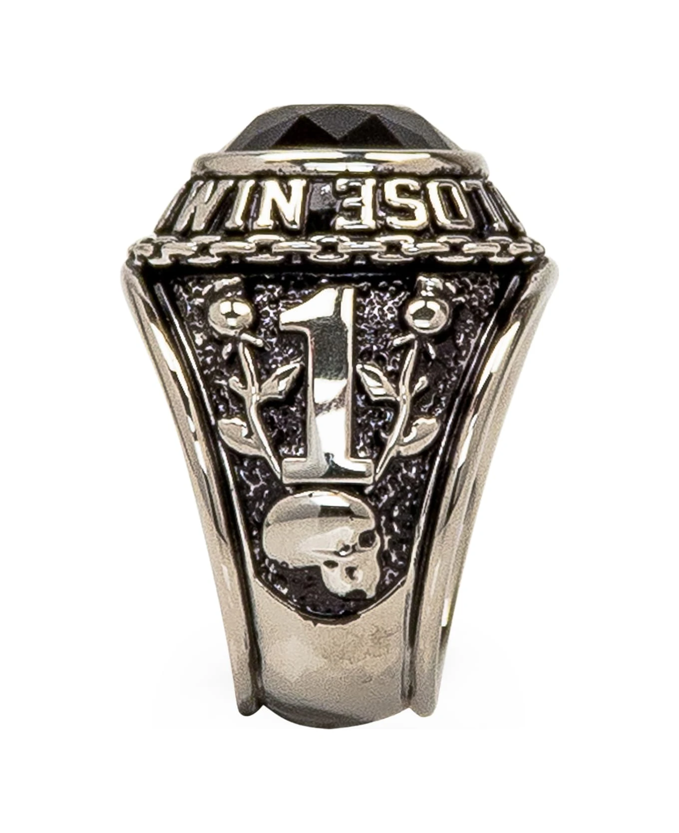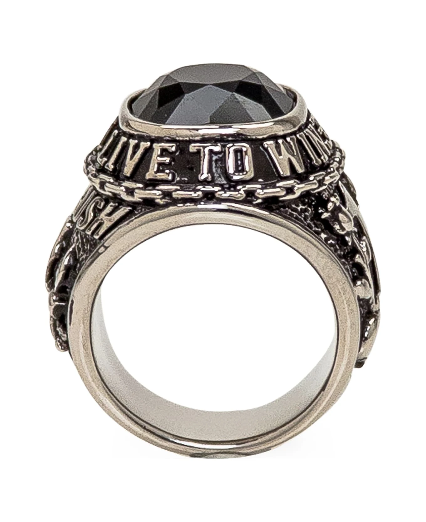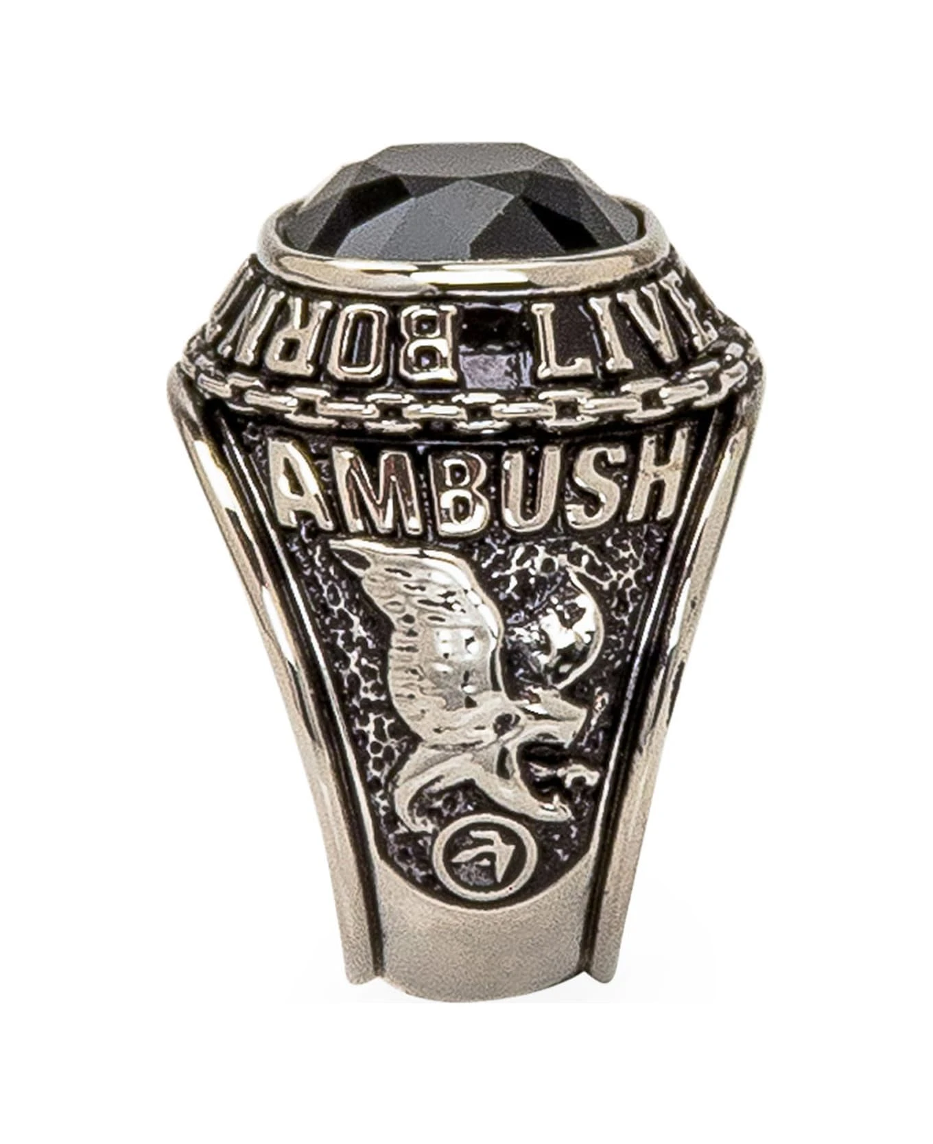 Silver ring with black stone. engravings with antique effect with embossed detail. Side logo.