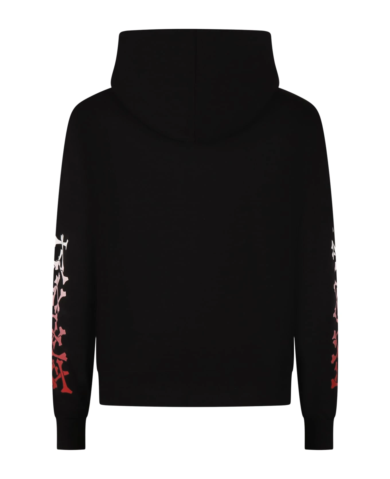 Black sweatshirt in brushed cotton, with long sleeves, hood, front pocket, ribbed cuffs and hem. It is embellished with logo on the chest and shaded bones print on the sleeves.