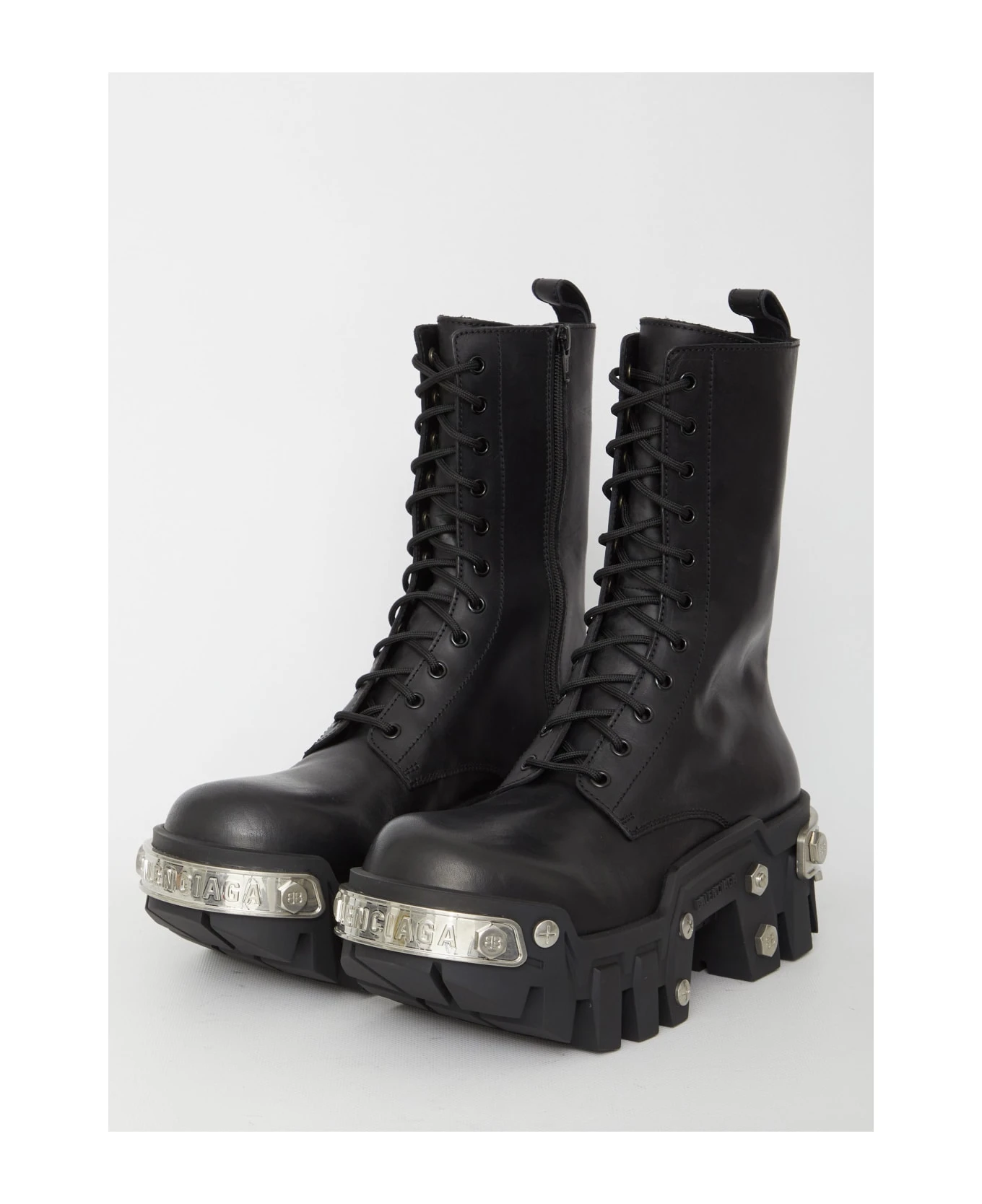 Bulldozer Lace-up boots in black calfskin with silver-tone metal details. They feature front lace-up, side zip closure, embossed Balenciaga logo at the front and at the back and lug rubber chunky sole. Any leather imperfections are not to be considered factory defects, but a peculiarity of the material.
