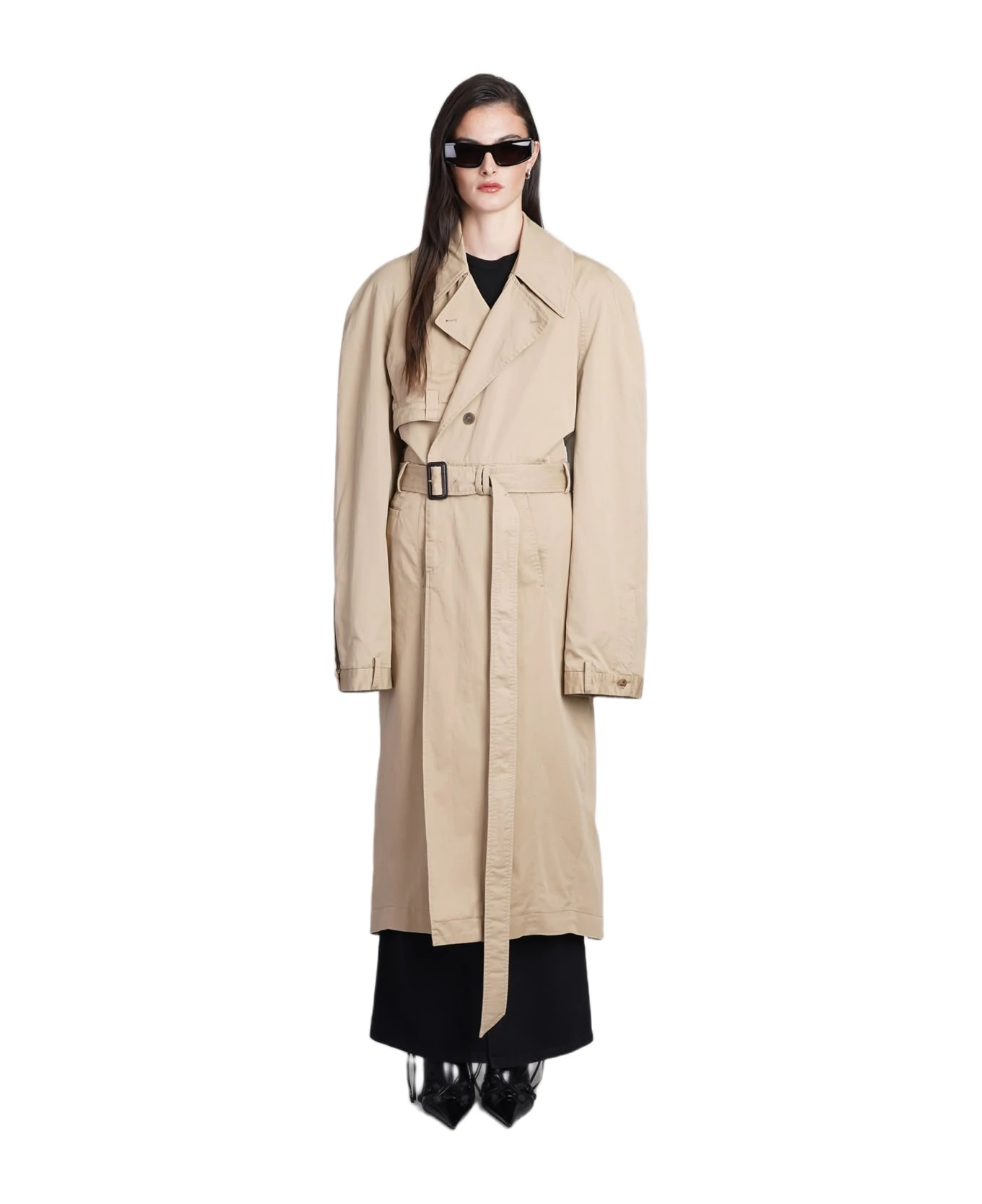 Coat in beige cotton, revers, long sleeves, pockets, waist belt loops, edges sleeves, asymmetrical cut, tartan print fabric lining, 100% cotton, 100% wool, Made in Italy, Model is 180 cm and wears size 34