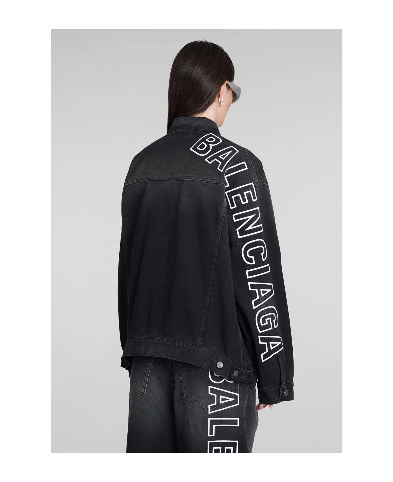 Denim Jackets in black cotton, collar, frontal buttoning, frontal pockets with flap, long sleeves, embroidery logo on sleeve, 100% cotton, Made in Italy, Model is 180 cm and wear a size S