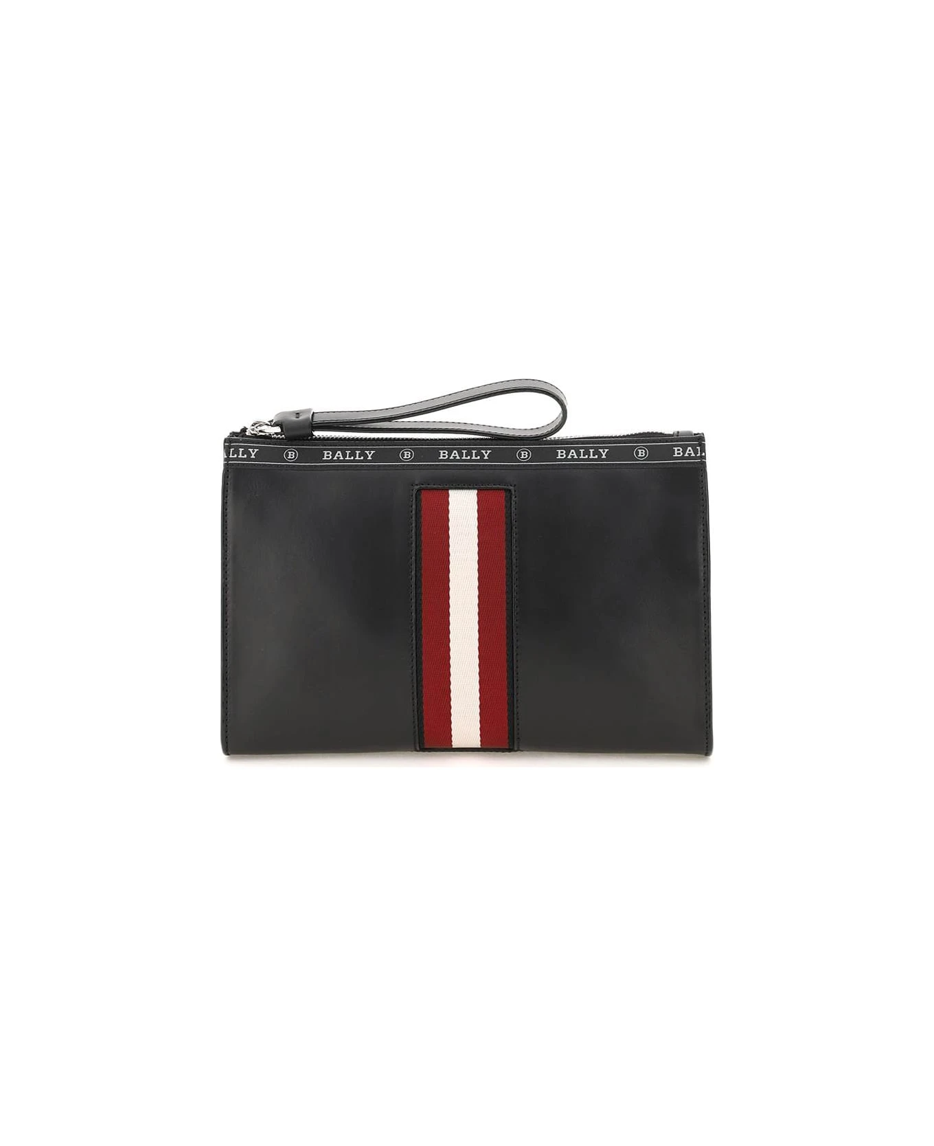 Haig pouch by Bally in smooth leather, characterized by the front iconic Bally Stripe webbing insert and by thejacquard logo ribbon on the top. Zip closure with leather zip puller which works as a wrist handle, leather logo tag stitched on the back. Branded fabric-lined interior with an open flat pocket and two small open pockets. Silver-finished metalware.