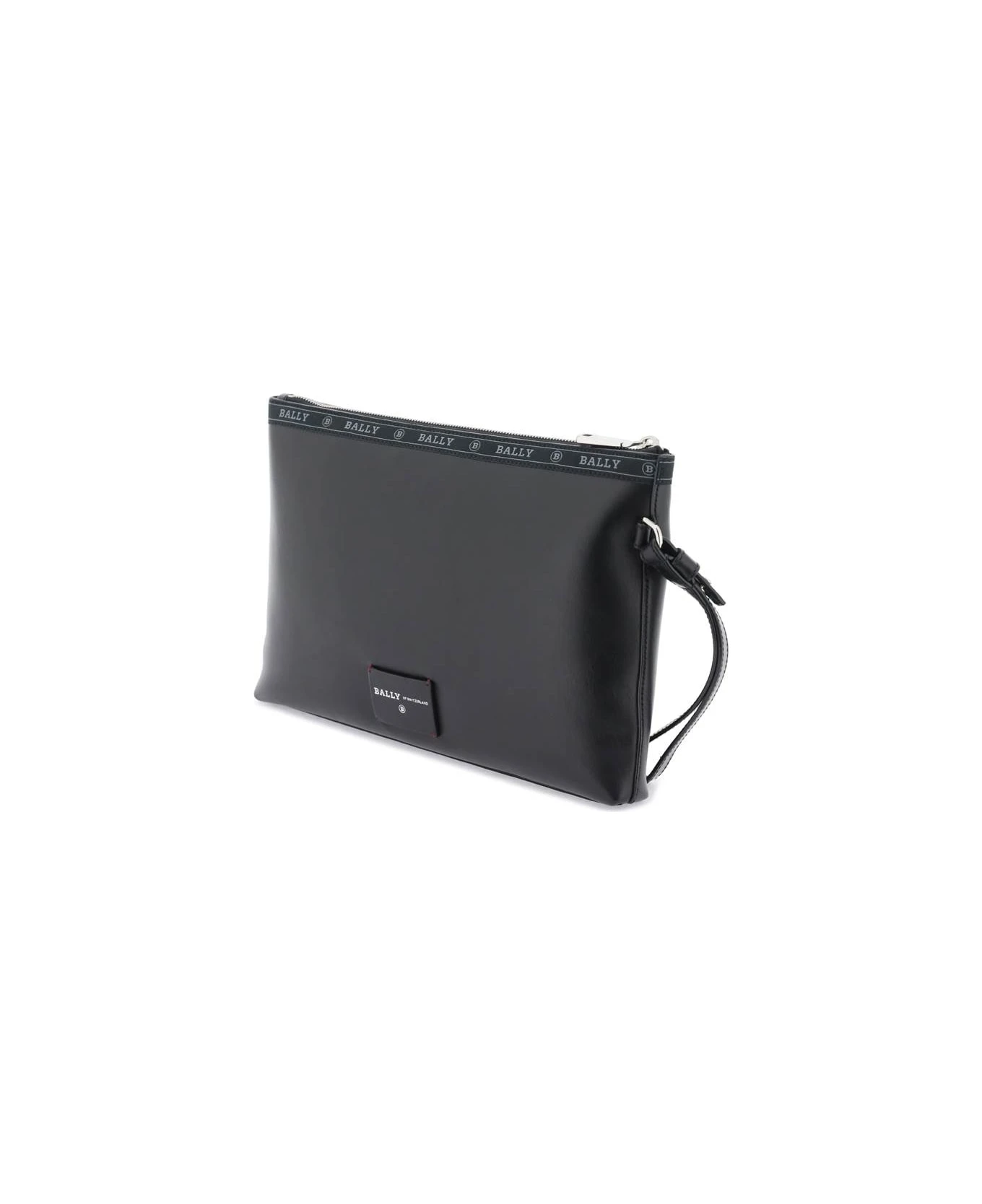 Hartland leather pouch by Bally with iconic Bally Stripe applique and zippered closure. Lined interior with one zippered and one open pocket, Switzerland patch on back, detachable wrist handle and silver-finish metalware.