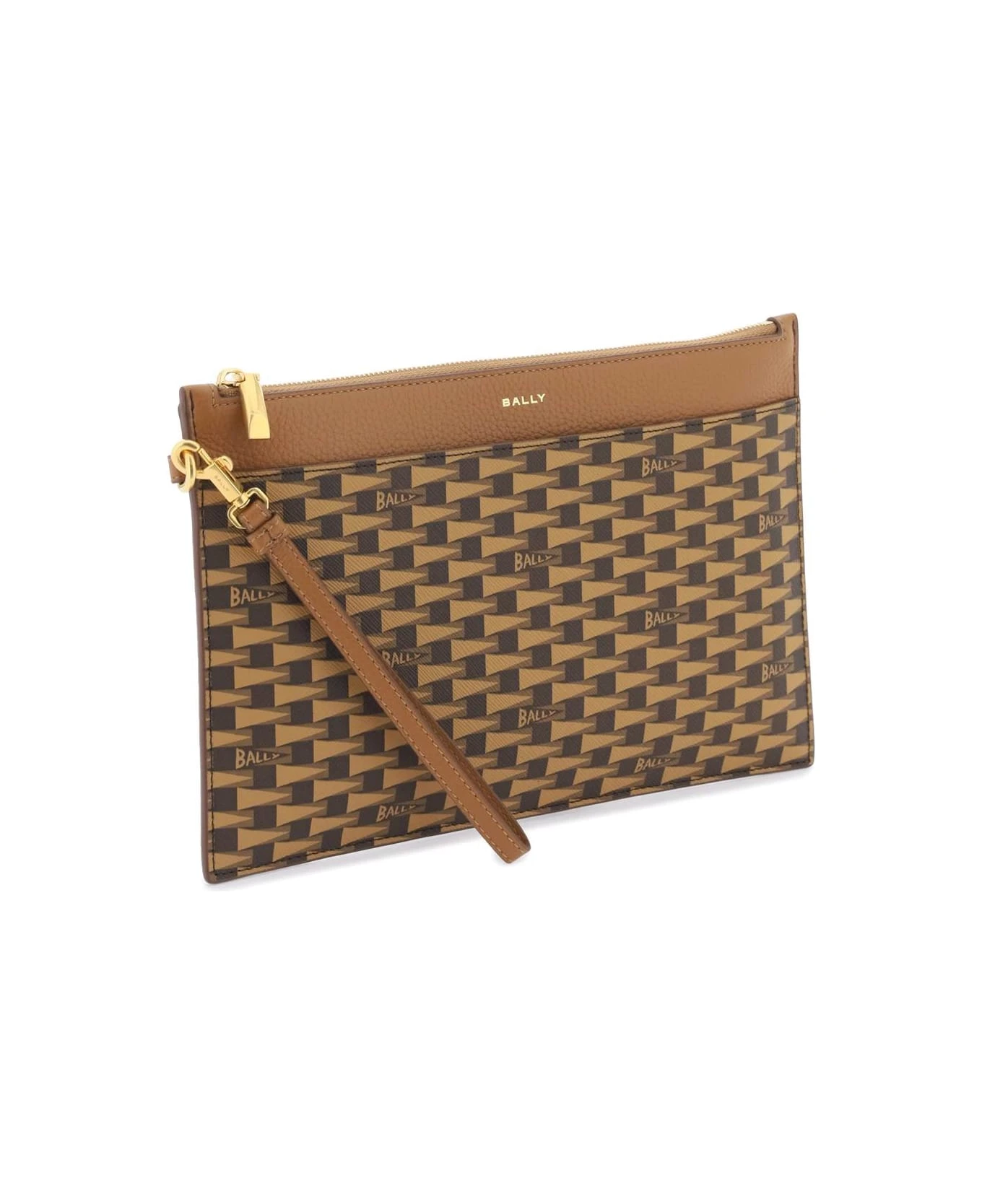 Bally pouch in coated canvas with iconic Pennant pattern and grained leather trim. Zip closure, fabric-lined interior with two open pockets, six credit card slots and one zippered pocket, detachable leather wrist handle, additional flat pocket at front. Gold-finished metalware.