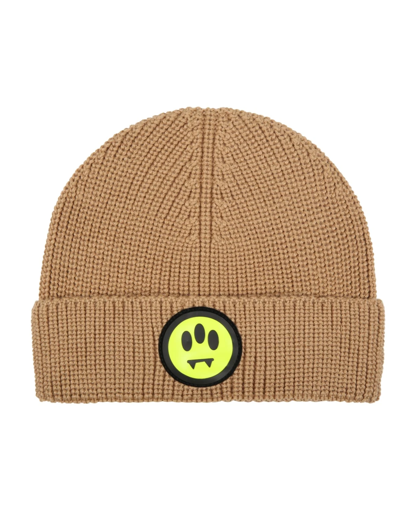 Beige ribbed hat, with turn-up, embellished with colorful iconic and rubbred smile, on the front.