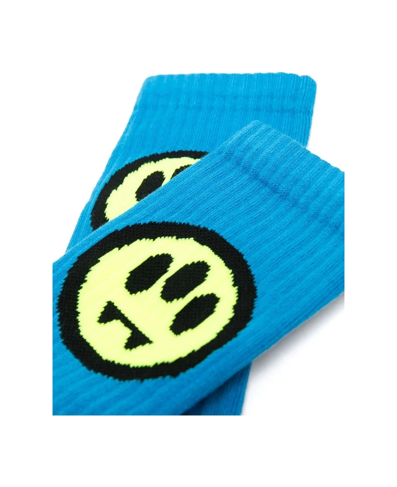 Blue monochromatic socks by Barrow with smiley face and contrasting jacquard lettering logo.