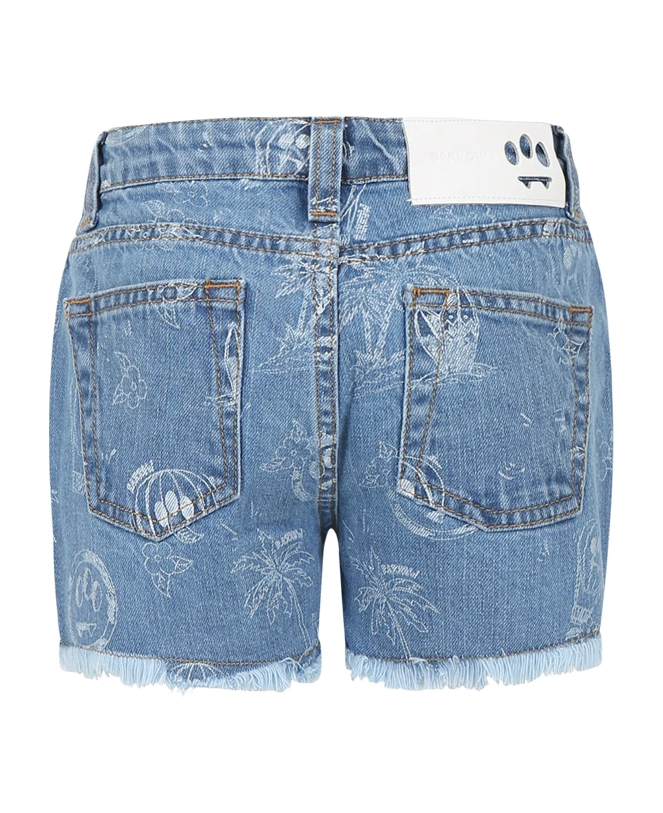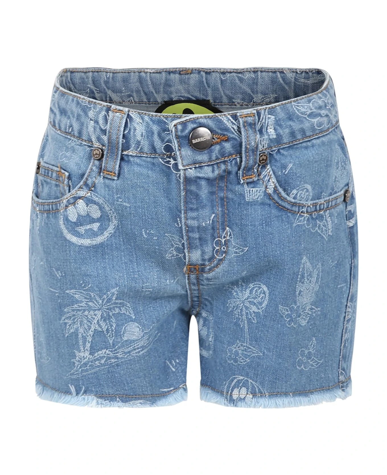 Light blue denim shorts, five pockets, with belt loops, zip and button closure, adjustable waist thanks to internal elastic bands, frayed hem. They are decorated with logo print and iconic all-over smiley, metal smiley elements. They come with a yellow logoed key ring.
