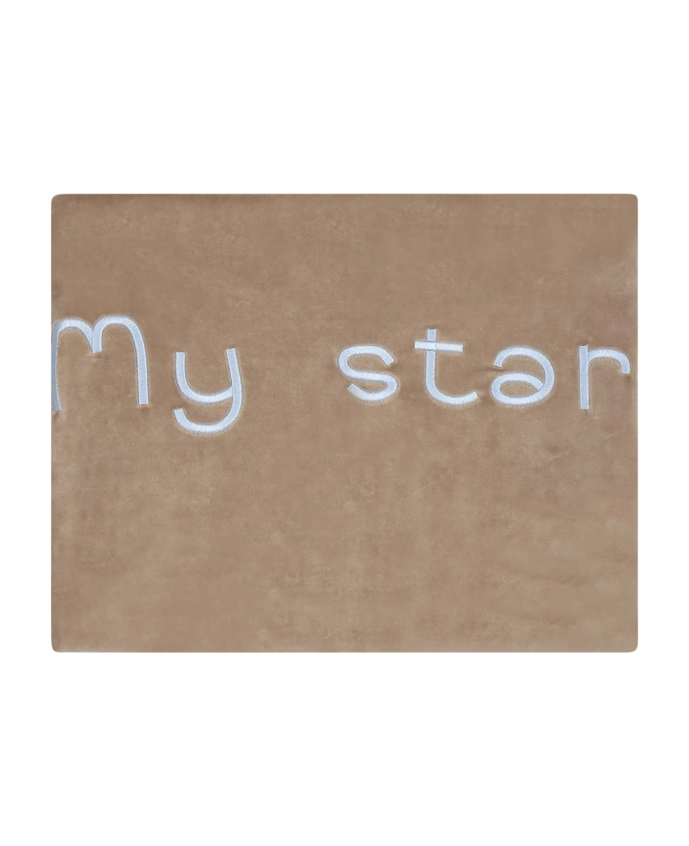 Beige star-shaped chenille blanket. It is embellished with “My star” writing embroidered on the front. 91 x 76 cm.