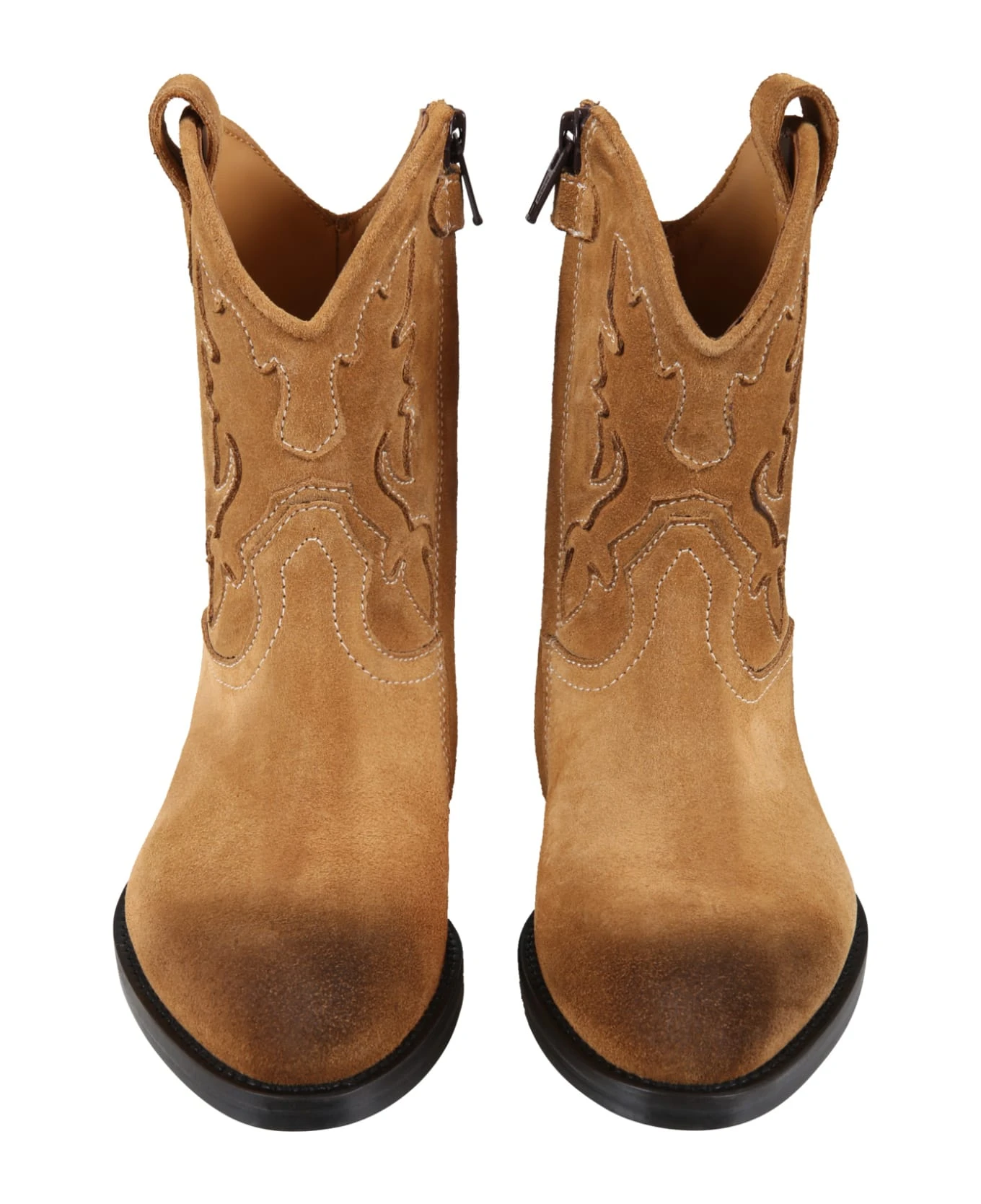 Beige suede texan boots with side zip closure and black heel.