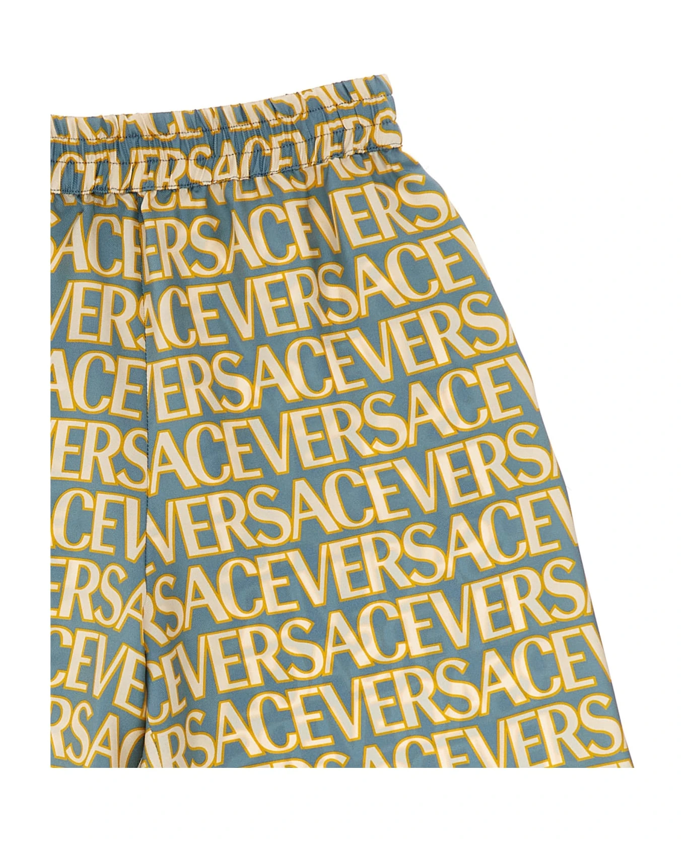 La Vacanza capsule bermuda shorts in silk twill with ‘Versace Allover’ print and elastic waistband.