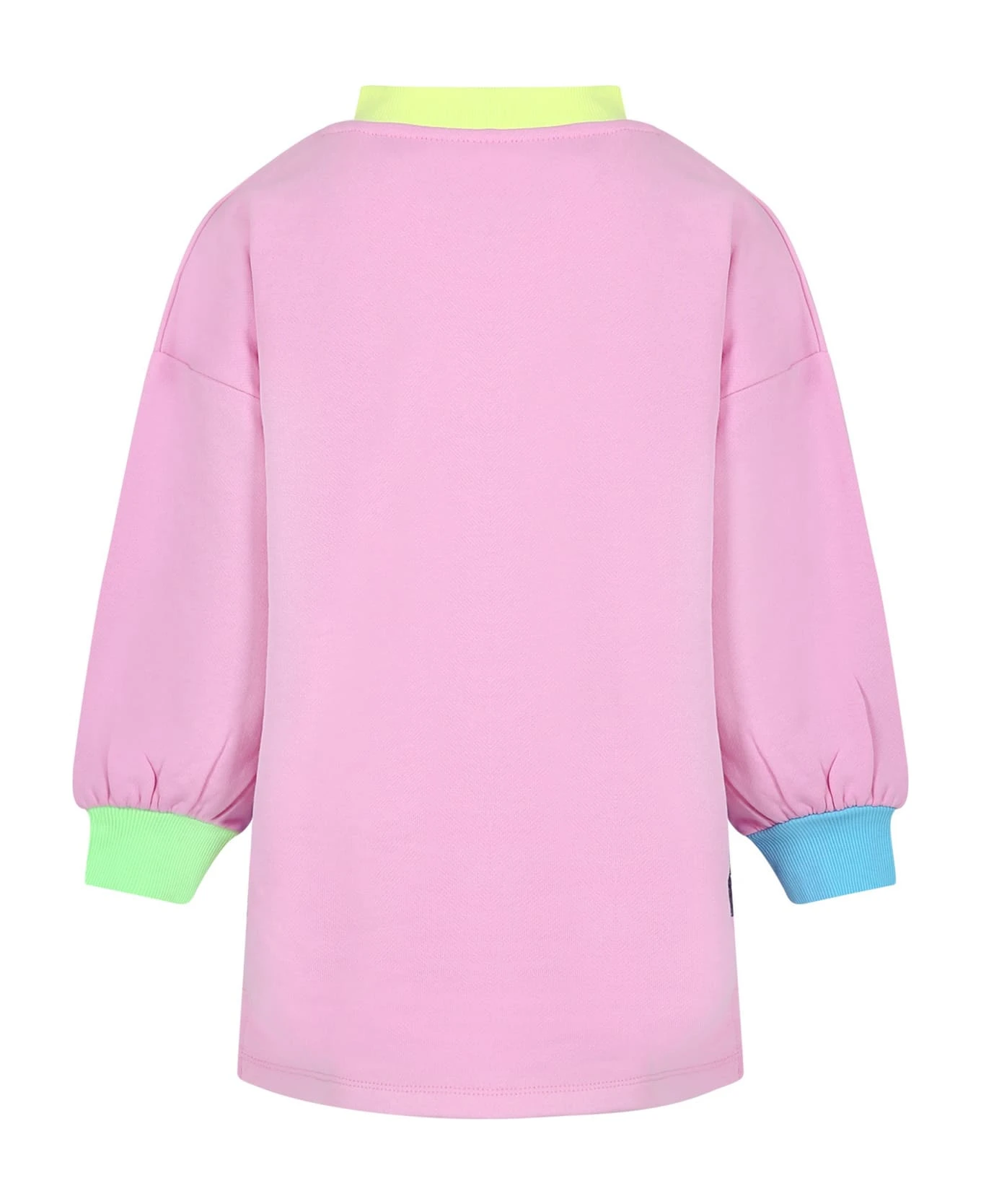 Pink dress in fleece cotton, long sleeves, with contrasting ribbed crew neck and cuffs. It is embellished with Wonder Woman print, sequins and logo on the front. It is a Dc Comics collaboration for Bllieblush.