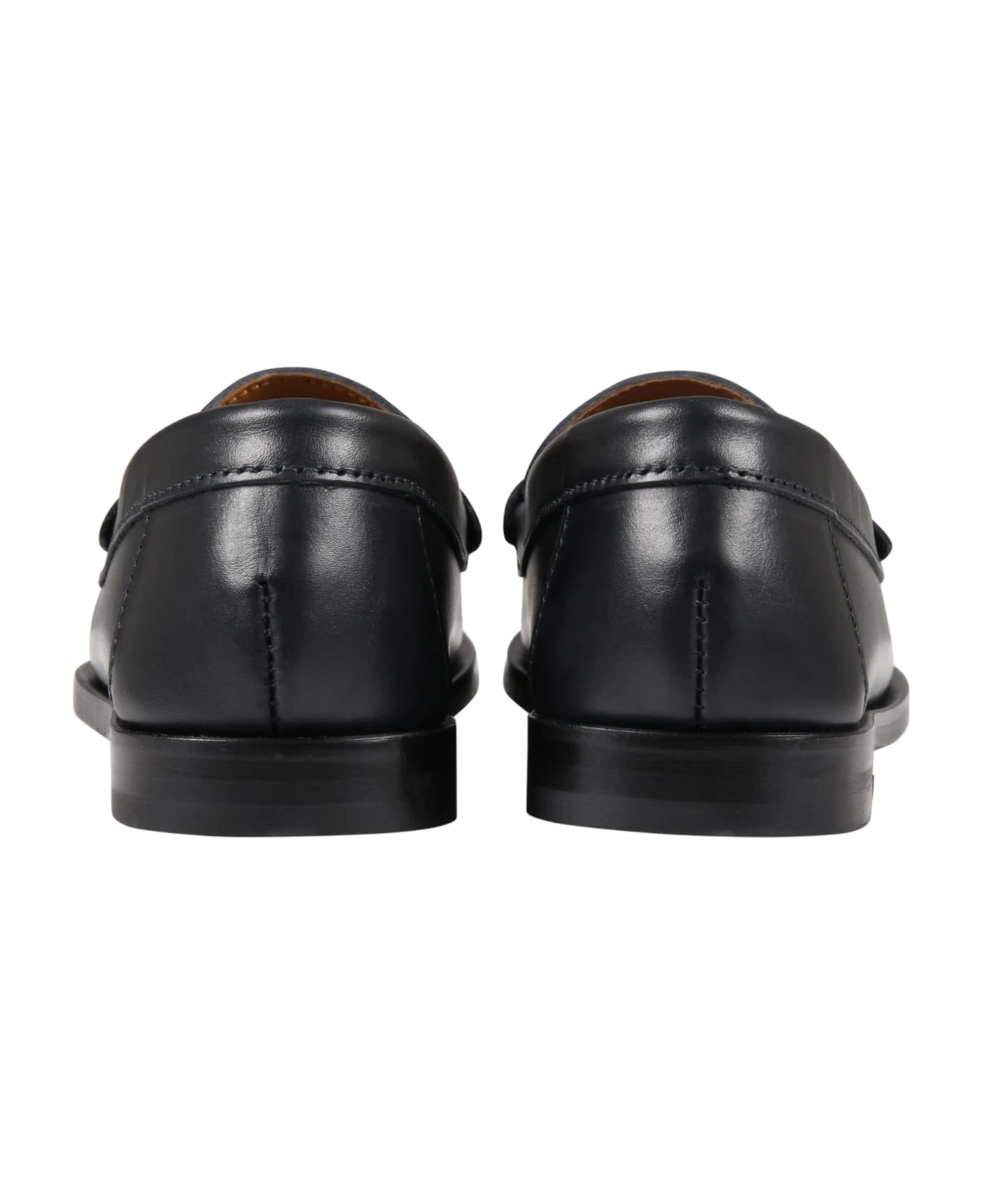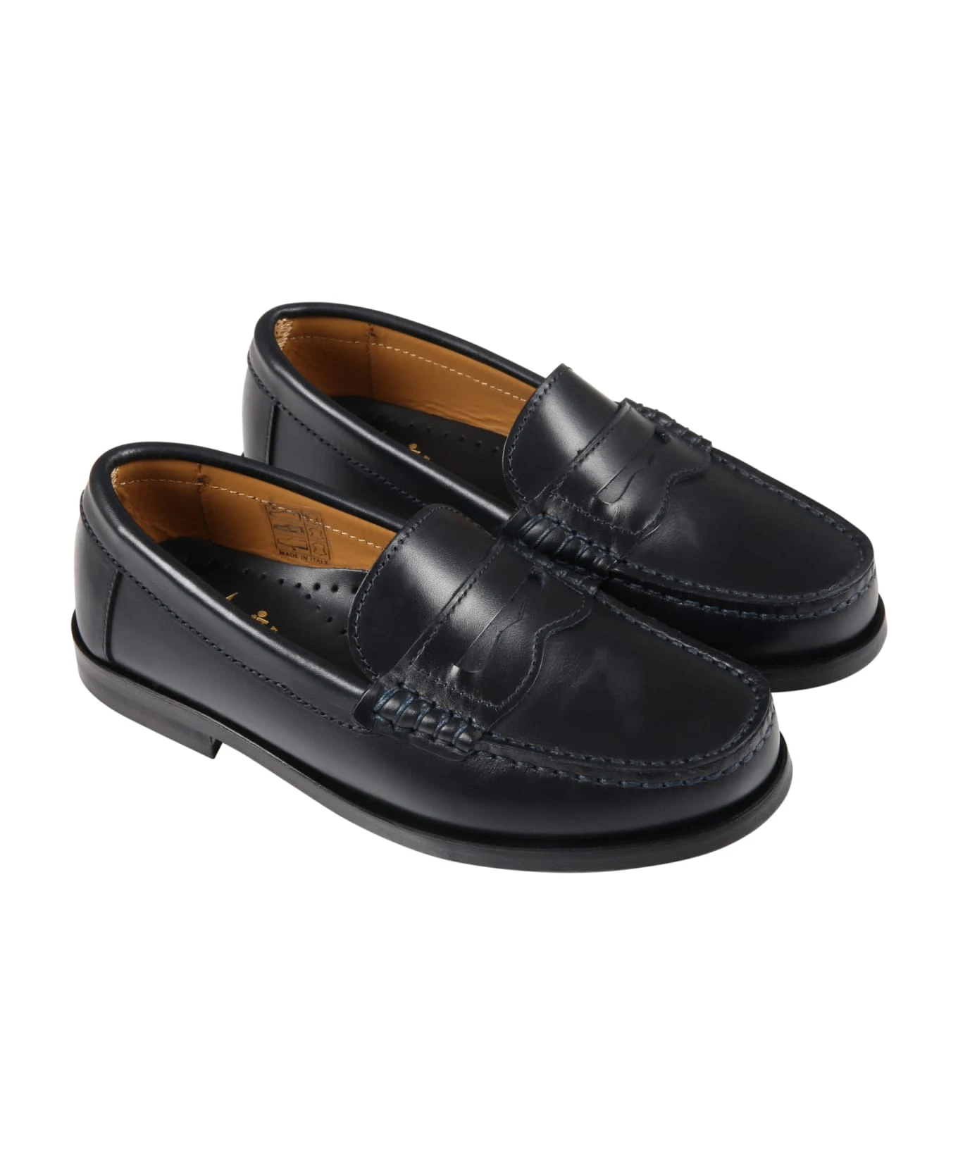 Blue leather loafers, with non-slip leather sole and low heel. They are embellished with stitching.