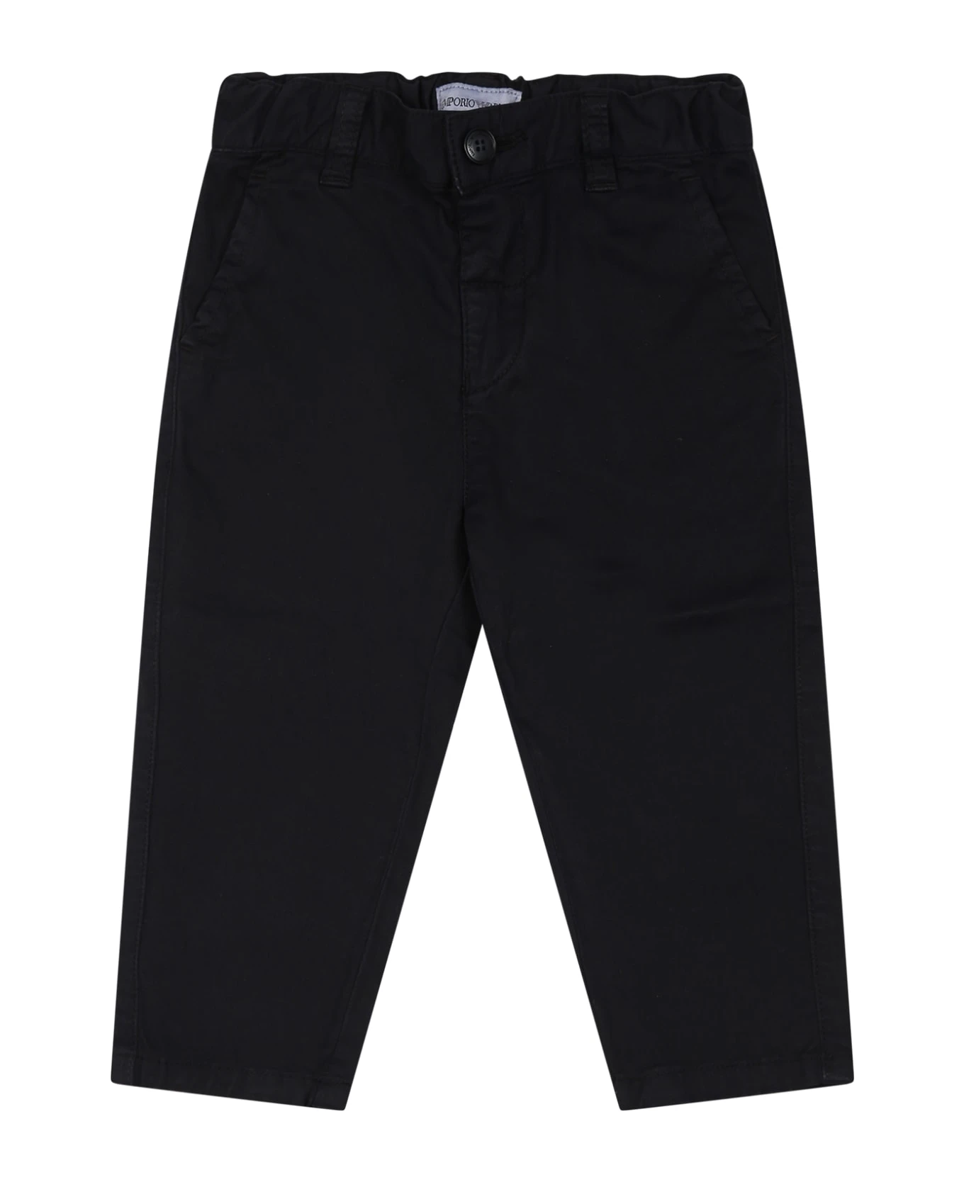 Blue trousers with belt loops, front closure with button, adjustable waist thanks to internal elastic bands with button and side pockets. They are embellished with the iconic eagle and metal logo on the back.
