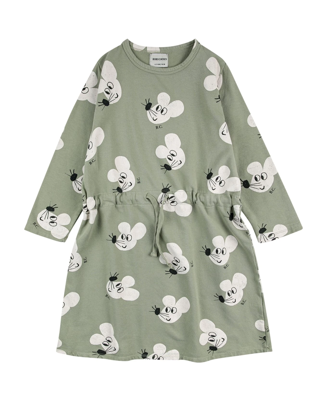 Green dress cotton fleece, long sleeves, round neck, adjustable drawstring waist. It is embellished with mice print and all-over logo initials.