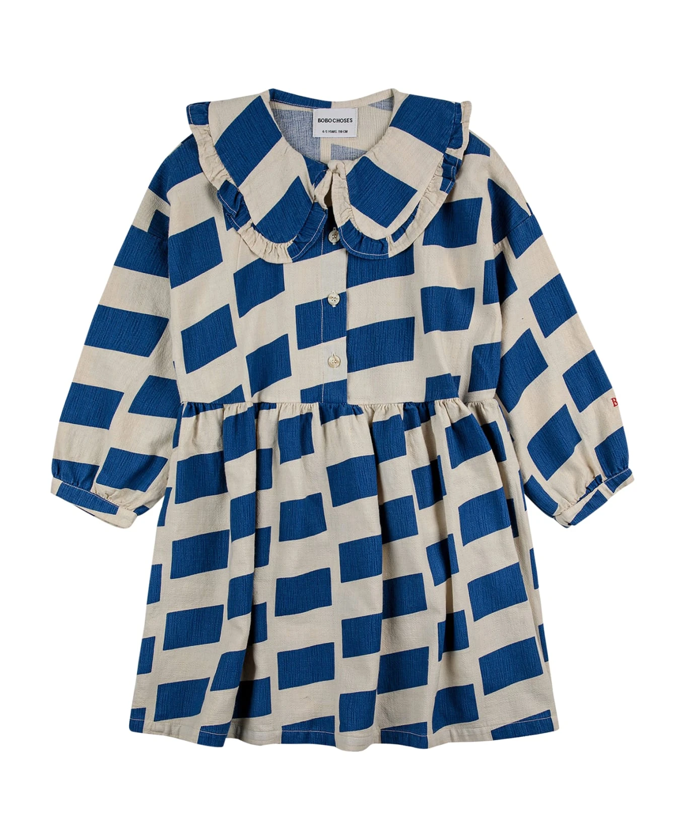 Ivory dress in cotton, long sleeves, collar with rouches, front closure with buttons. It is embellished with contrasting embroidered logo initials on the sleeve and all-over check print.