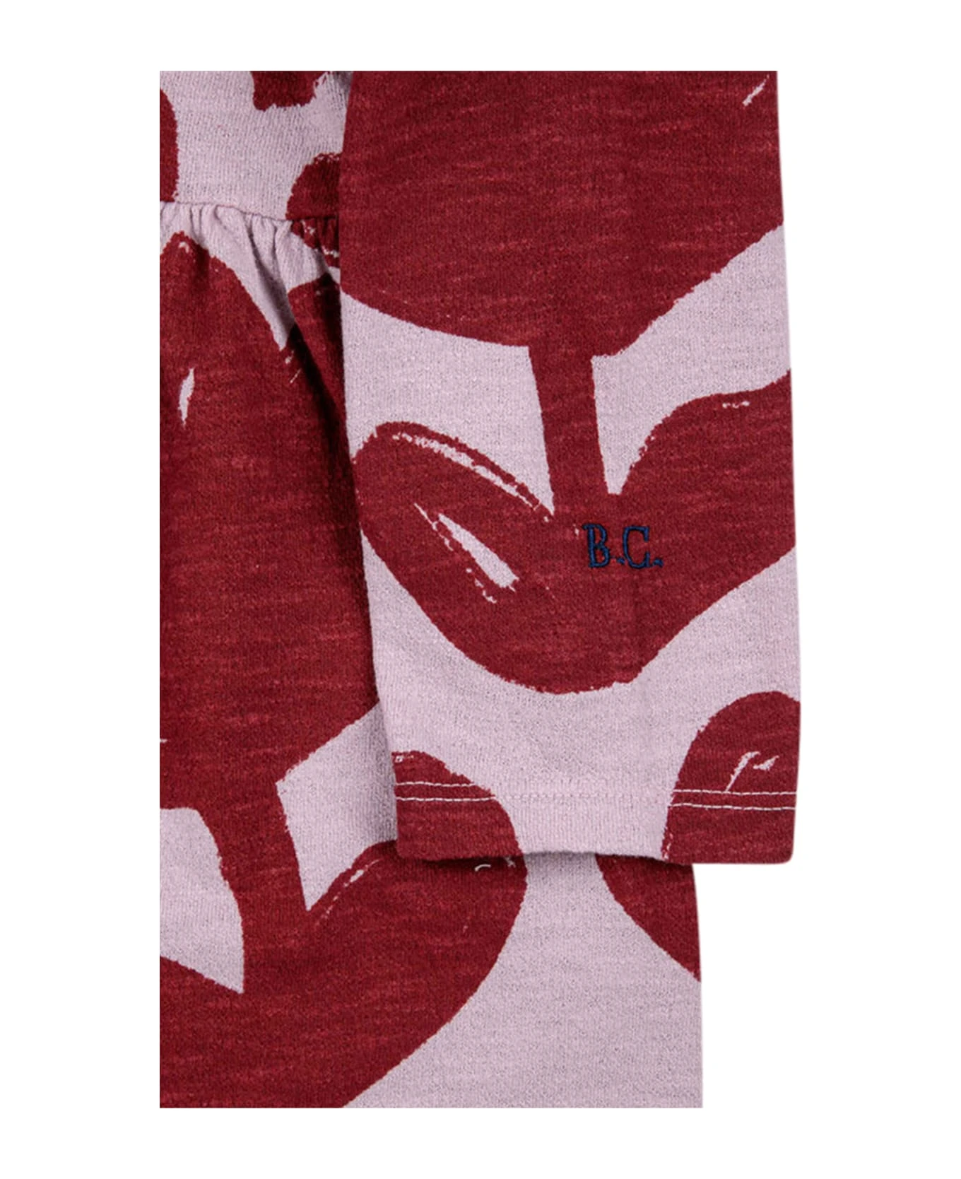 Pink dress in organic cotton, long sleeves, crew, rouches on the shoulders. It is embellished with all-over contrast and initial embroidery of the logo on the sleeve.