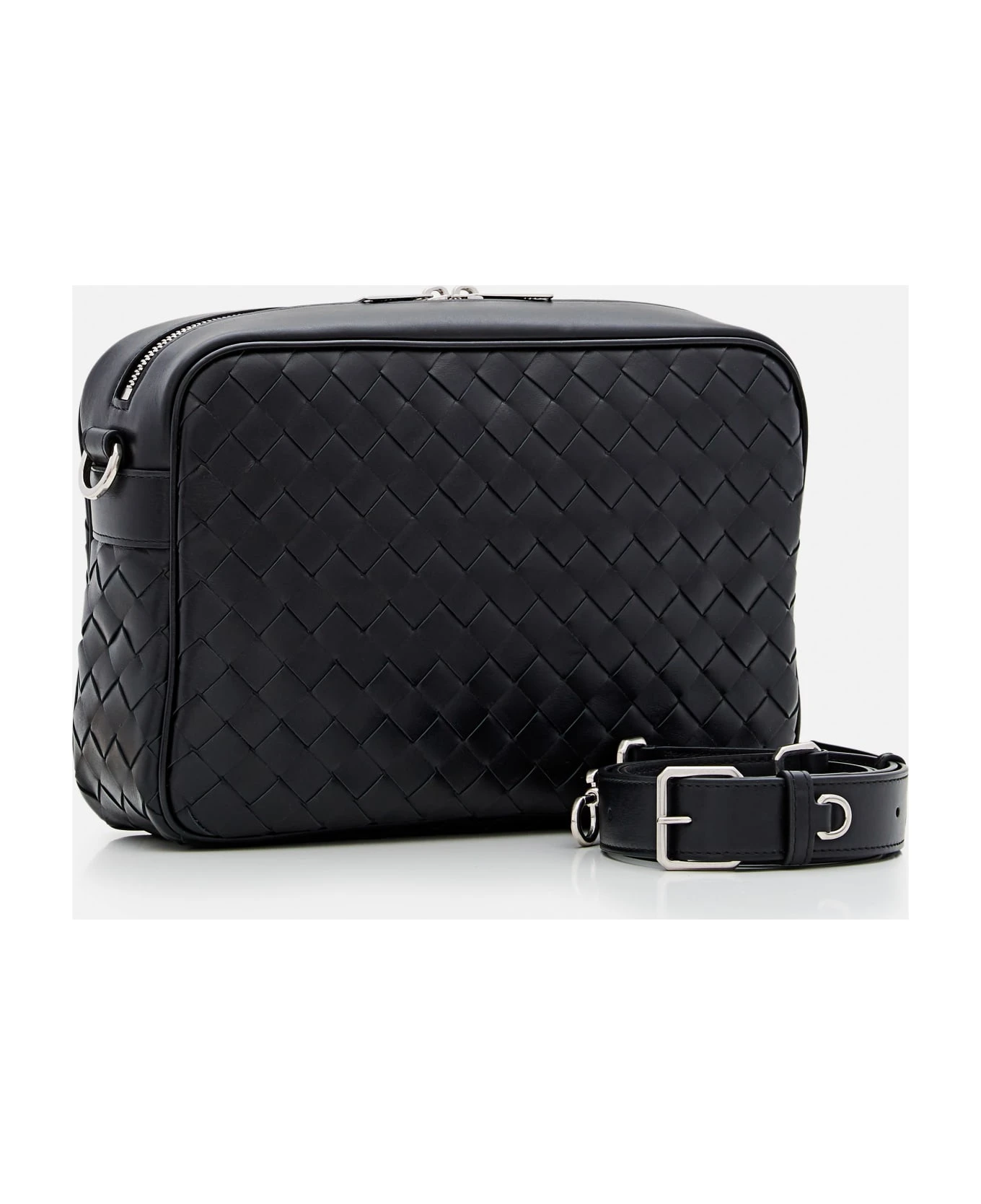 Camera bag. Small Intrecciato leather. Closure with double metallic zip. Detachable leather shoulder strap. Color: black.