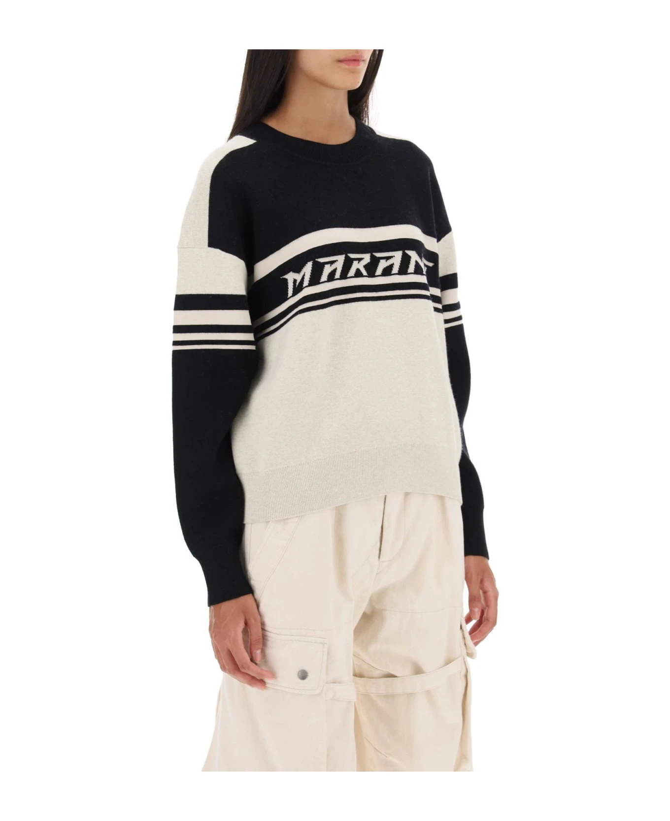 Marant Etoile sweater crafted in two-tone cotton and wool blend stockinette-stitch knit with jacquard logo lettering on the chest. It features ribbed crew neck, cuffs and hem. Boxy cut with relaxed fit enhanced by dropped shoulders. The model is 177 cm tall and wears size FR 36.