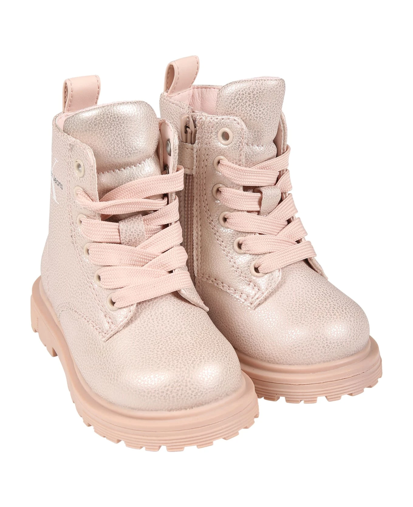 Pink faux leather combat boots, with rubber sole, side zip lace closure, round toe. They are embellished with logo on the side. They are made from recycled polyester.