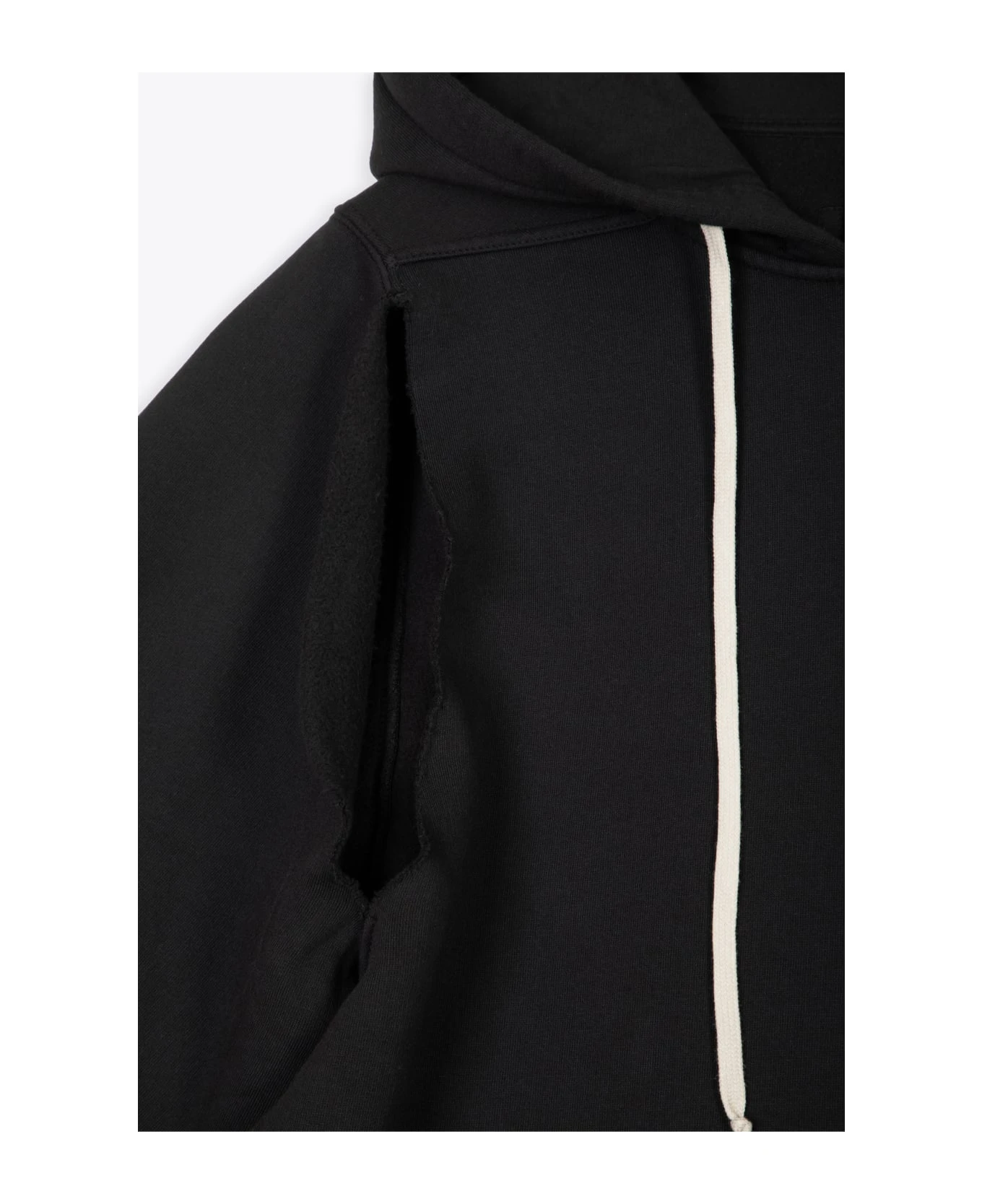 Black cotton hoodie with drawstring. Sleeve opnening detail to wear the item sleeveless. Ribbed cuffs. Straight bottom hem. Relaxed fit. Composition: 100% cotton. Made in Italy.