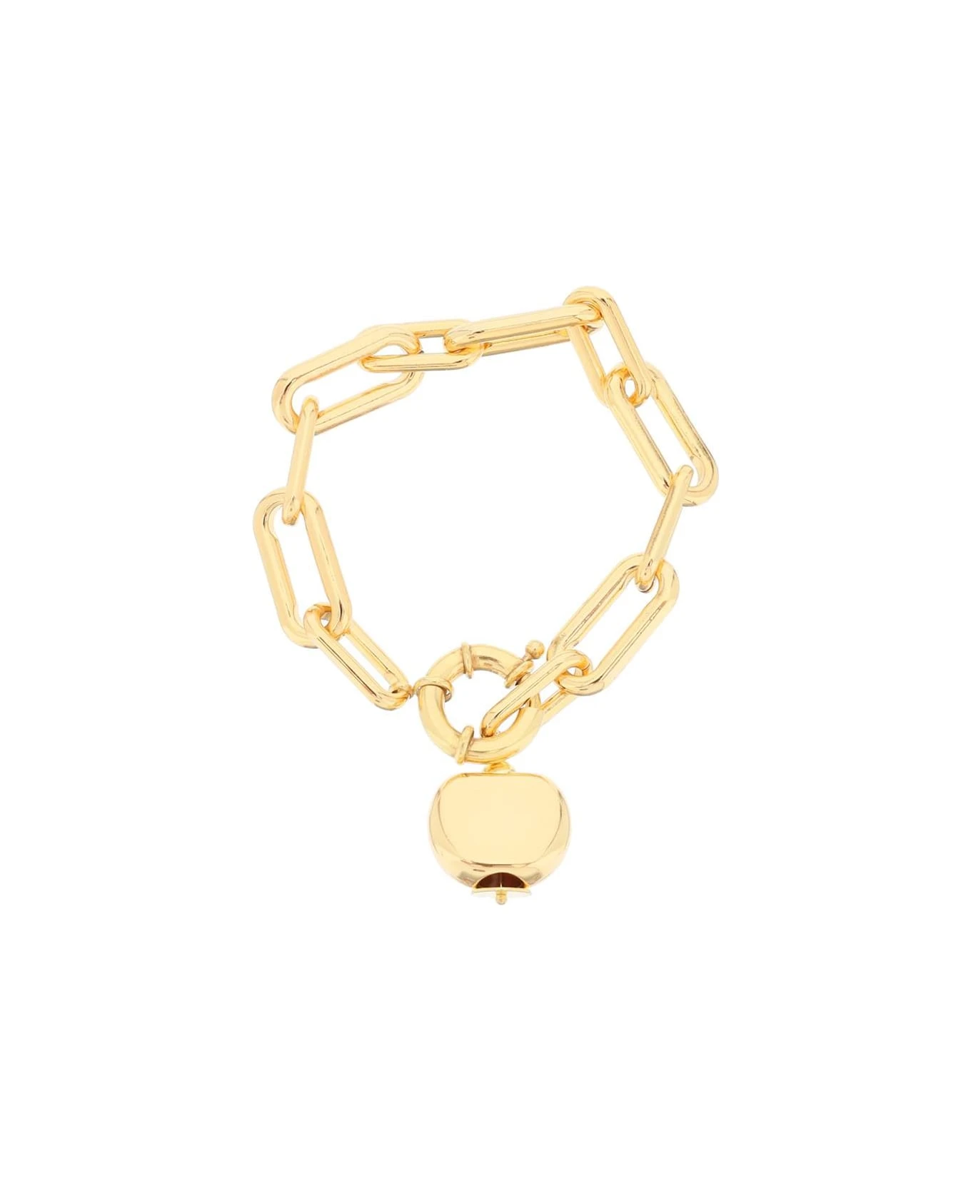 Chain bracelet by Timeless Pearly crafted of gold-plated brass with charms and interlocking clasp. One size fits all.