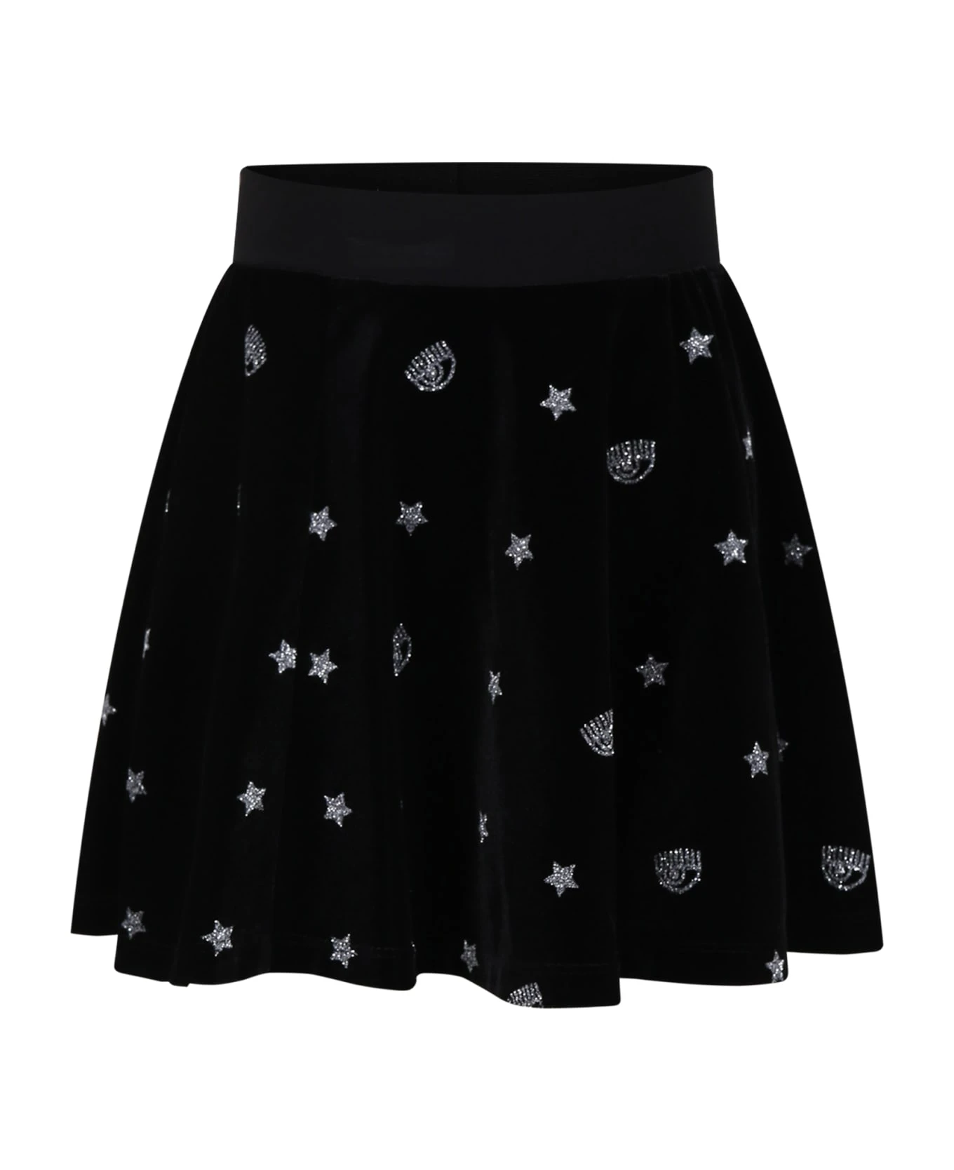 Black chenille skirt, with elasticated waist. It is embellished with all-over lurex eyestars.