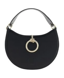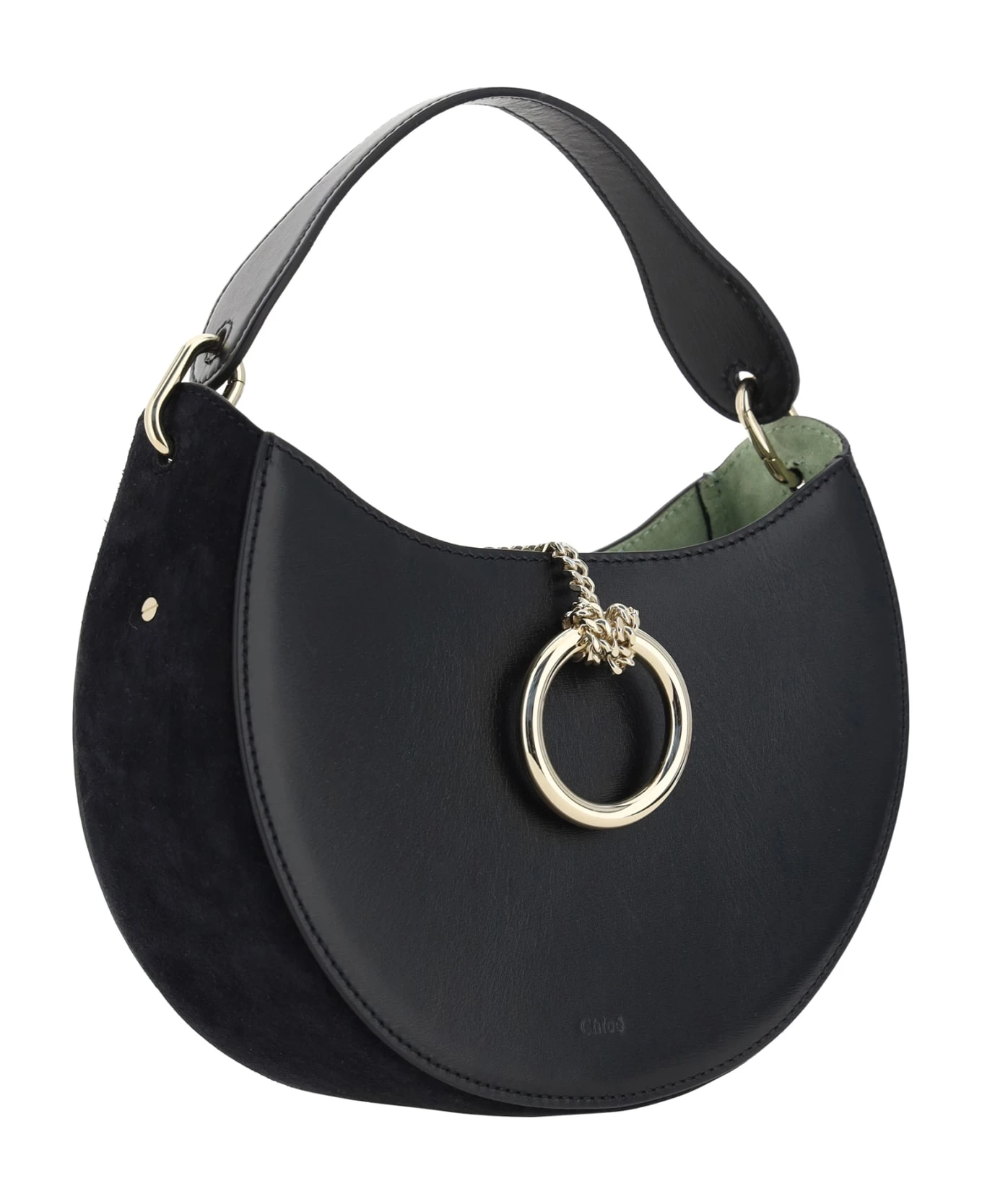 Calfskin arlene handbag by chloé, triple interior compartment, open top pattern, interior welt pocket, removable and adjustable leather shoulder strap, press-stamped brand logo on front, iconic o-ring pendant on front.