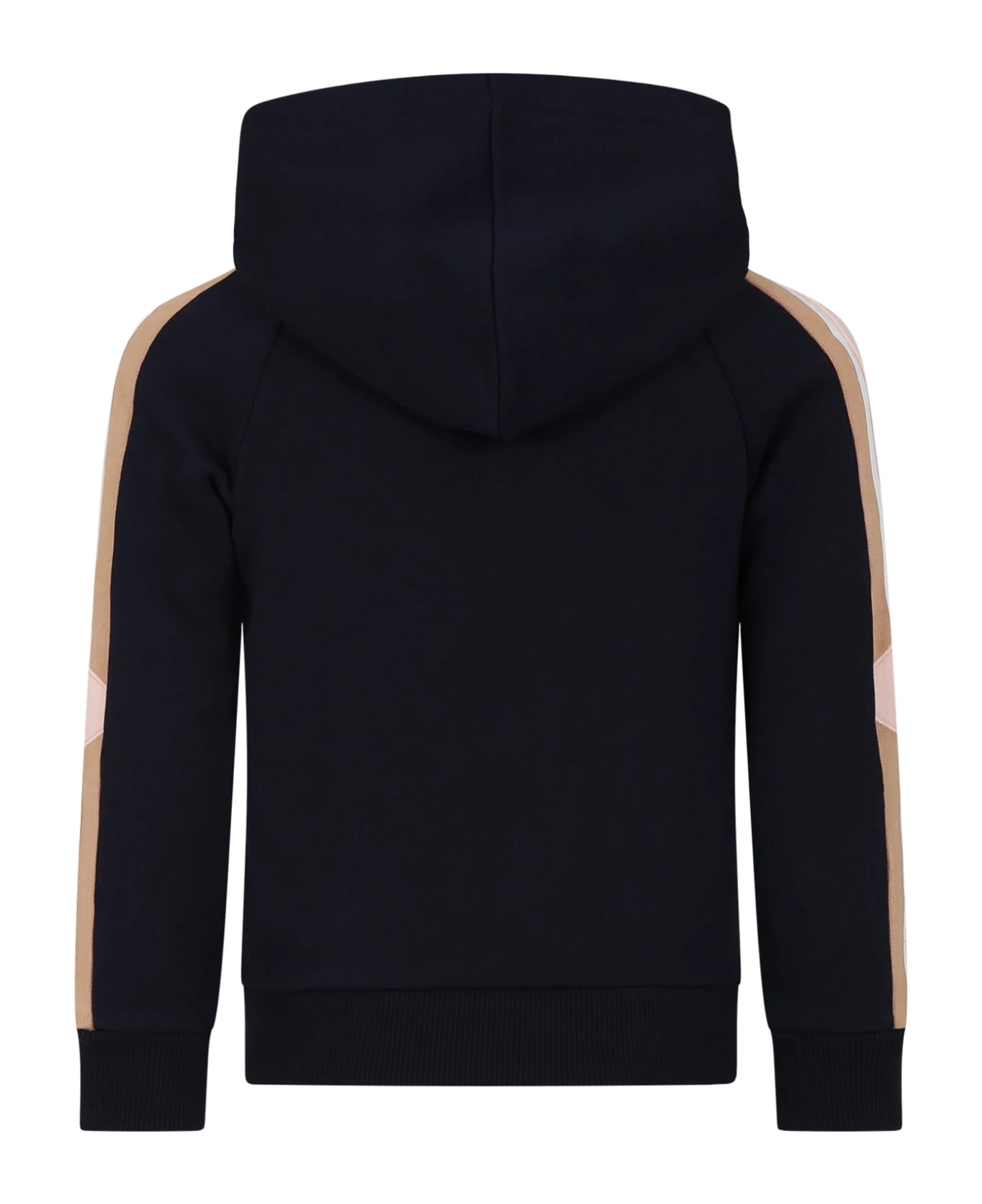 Blue sweatshirt in cotton fleece, with long sleeves, hood, front zip closure, side pockets and pink and beige details on the sleeves. It is embellished with embroidered logo on the chest.