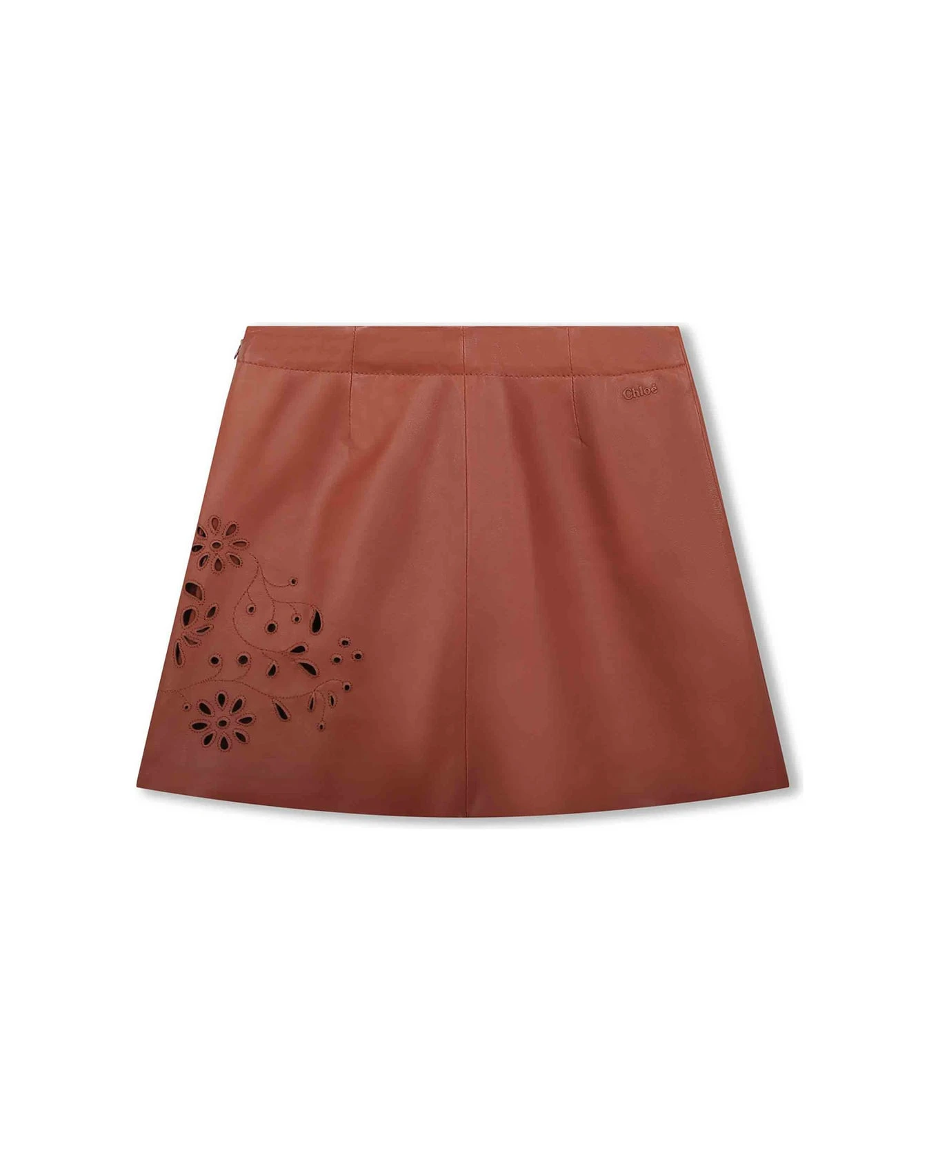 Chloé Kids skirt made of brick red leather and embellished with tone-on-tone floral carving embroidery. Side zip fastening. Above-the-knee length.