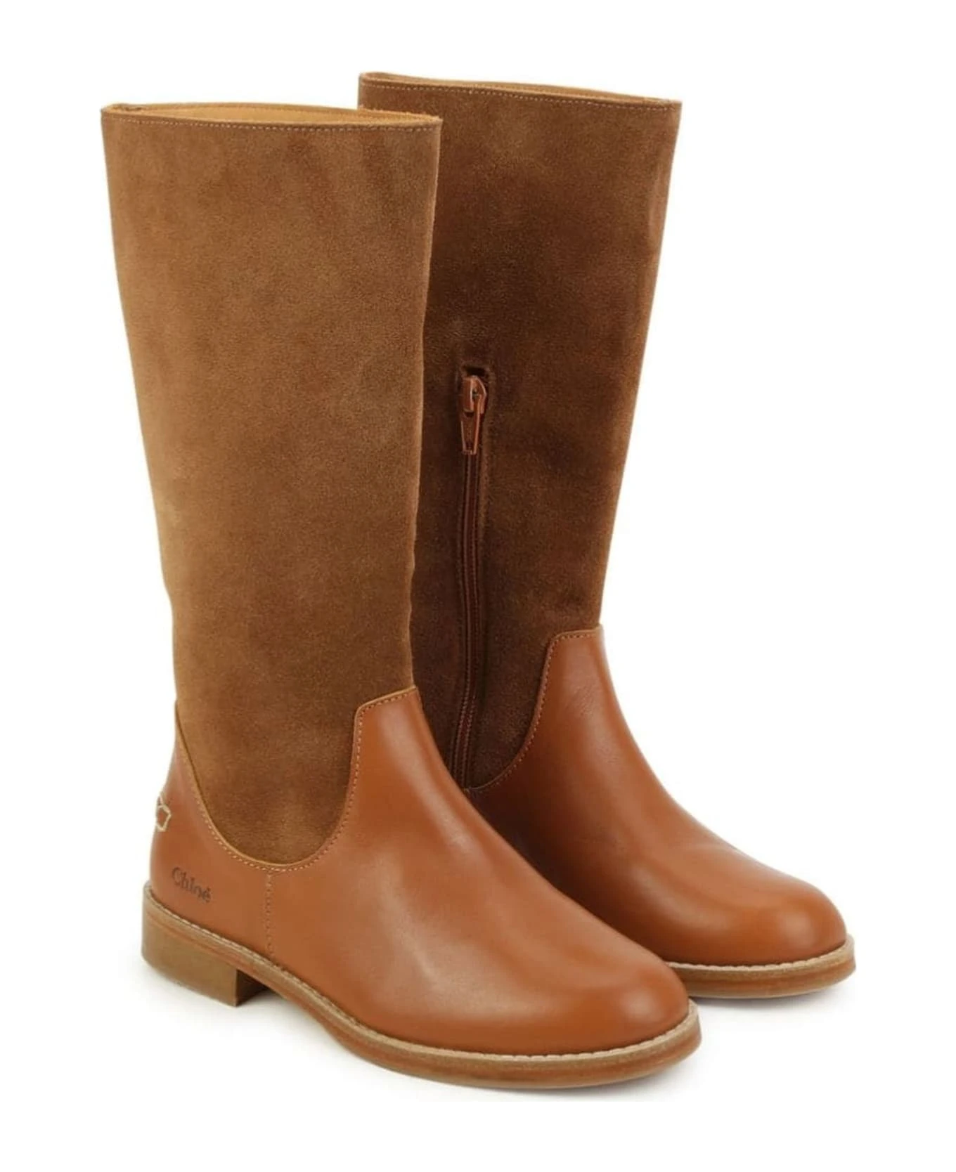 Camel brown calf suede boots, calf leather, smooth grain, panelled design, decorative stitching, engraved logo, round toe, side zip fastening, leather flat sole