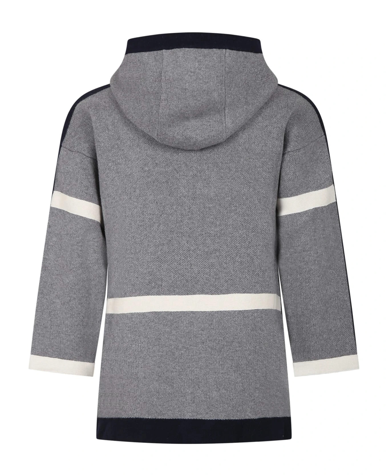 Grey knitted coat with hood, side pockets, hidden popper fastening and gold-tone D-ring at the neck; it is embellished with blue and ivory trims and blue inlaid logo on the side.