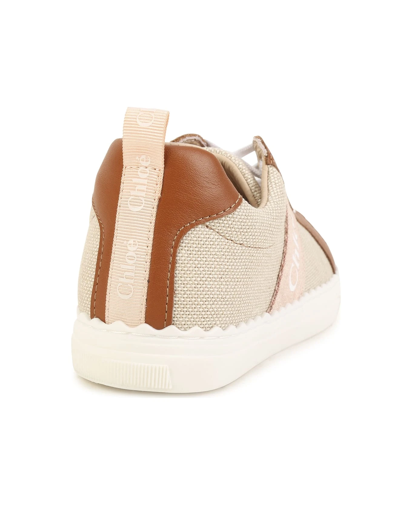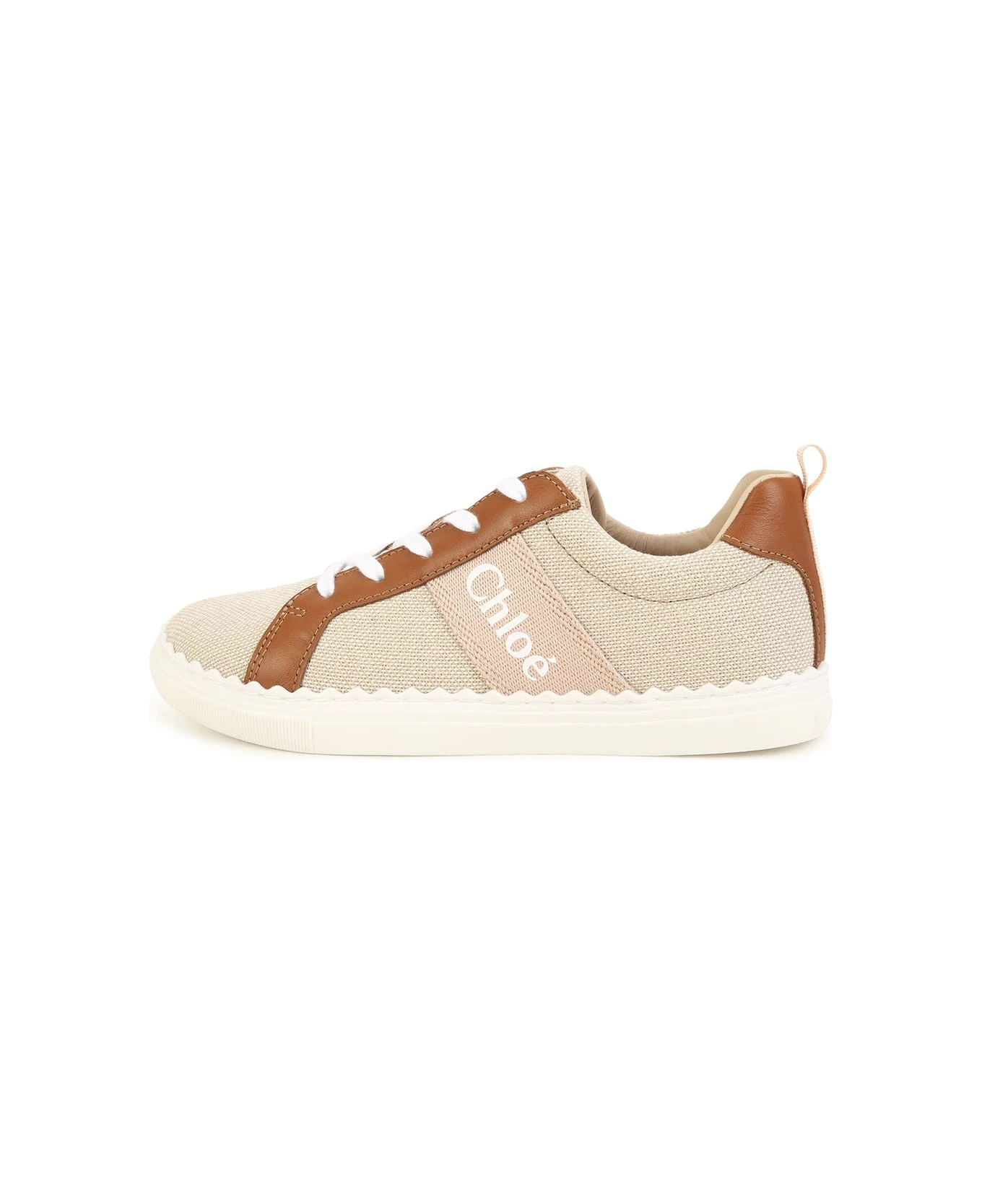 Lauren sneakers by Chlo ids made of natural canvas and tan leather and featuring a round toe, lace-up design, logoed back pull, contrasting logo band on the outer side and white rubber sole with iconic wavy edges.
