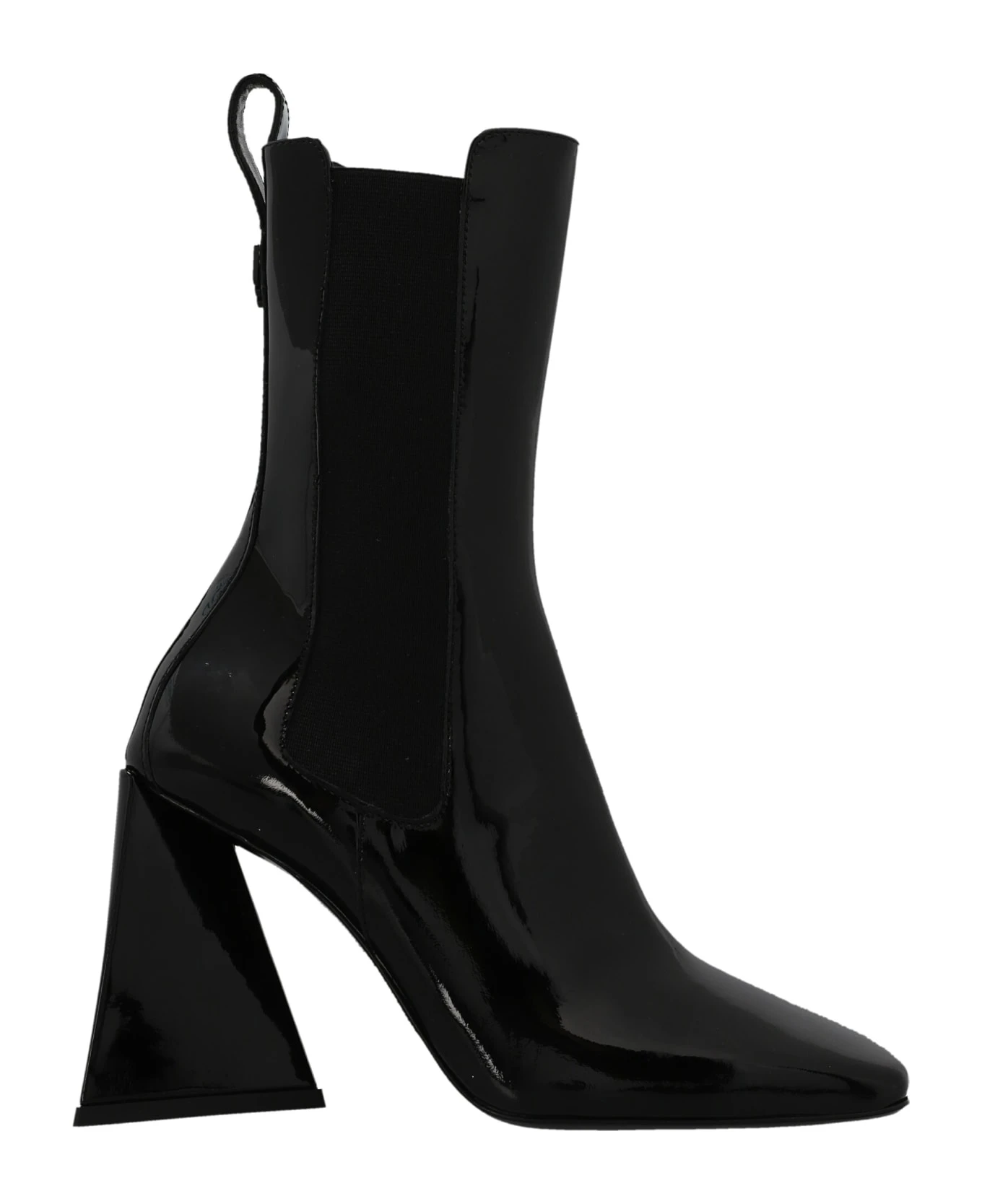 ‘Devon’ patent leather ankle boots with side elastic, square toe and sculpted heel.
