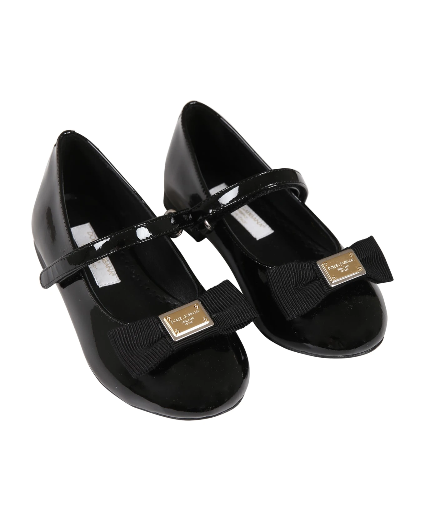 Black patent leather ballet flats, with rubber sole, velcro strap and toda. They are embellished with a grosgrain bow and metal logo patch on the top.